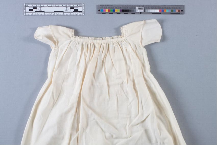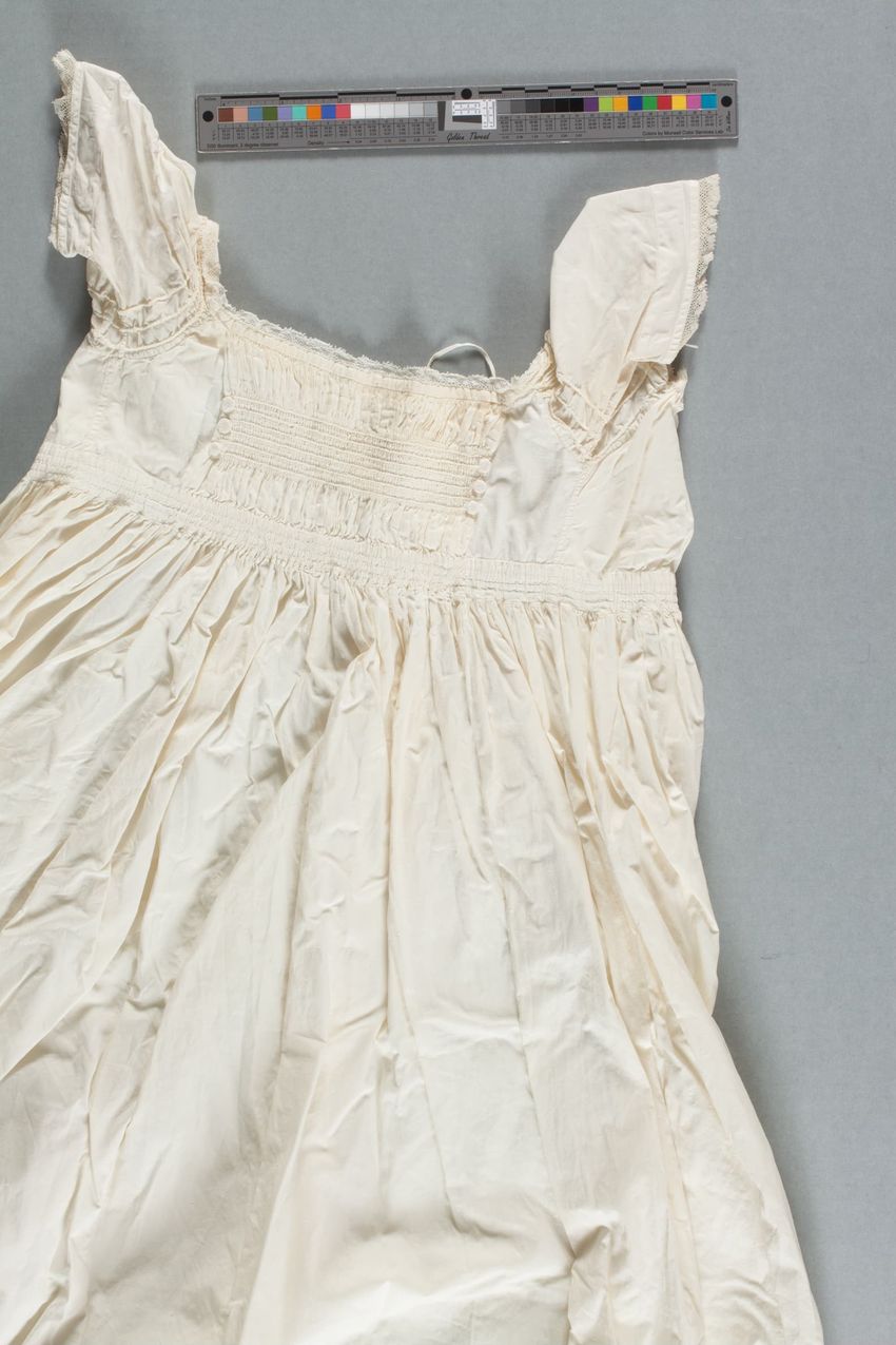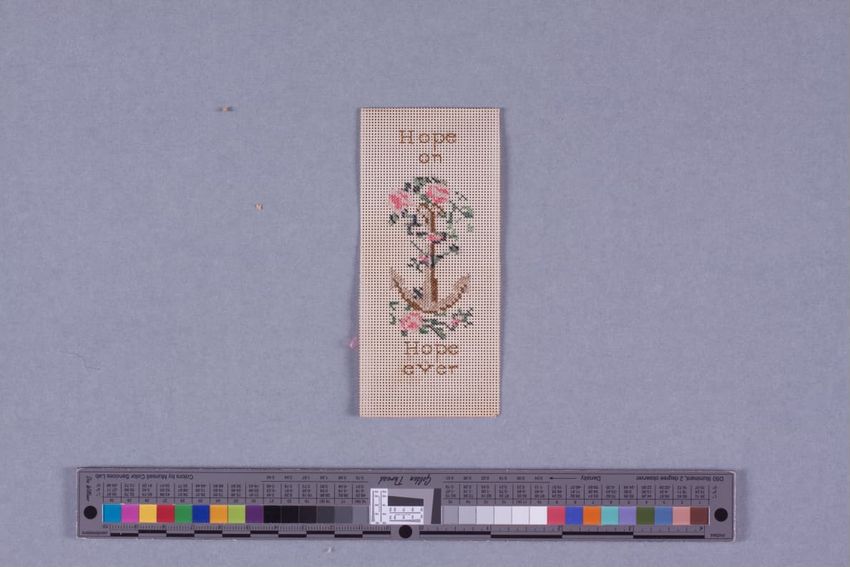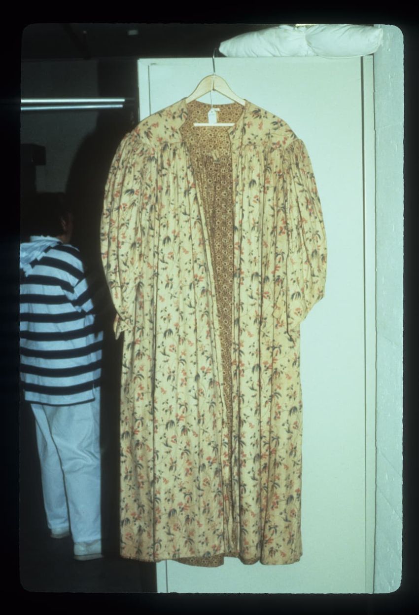 Green silk cover with white, yellow and darker green stripe woven at bottom; wooden shaft and ribs; brass tips on ribs; pointed, carved brass ferrule; long, carved brass slider; carved bone and brass hooked handle; brass hoop closure on silk tie.