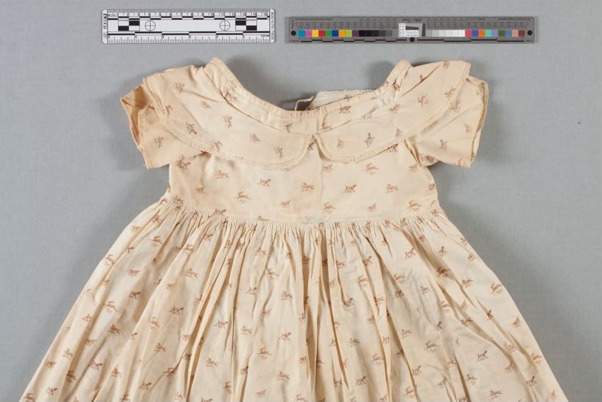 Brown, blue plaid, standing collar, long sleeves, lace front with pearl buttons, hook and eye back with small strap closer and flared skirt, laced with blue, string and tassle.