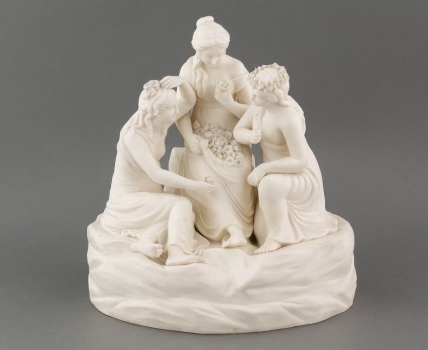 Earthenware sugar bowl with chocolate brown matte glaze on red body with relief-molded floral clusters, floral medallions, and satyr heads on band around neck; squat, lobed body with scroll-shaped handles.