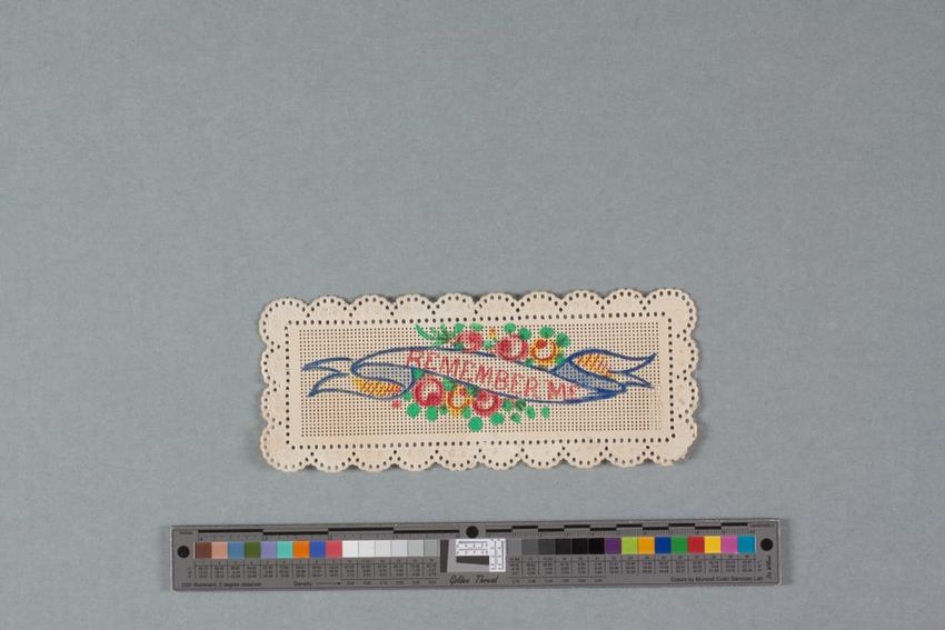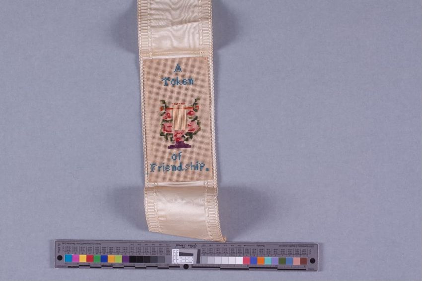 textiles, ribbon (material), silver (metal), plastic (organic material), paper (fiber product), stamps (marks), printing (process)