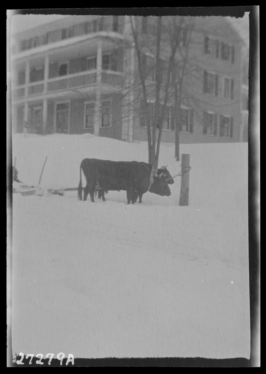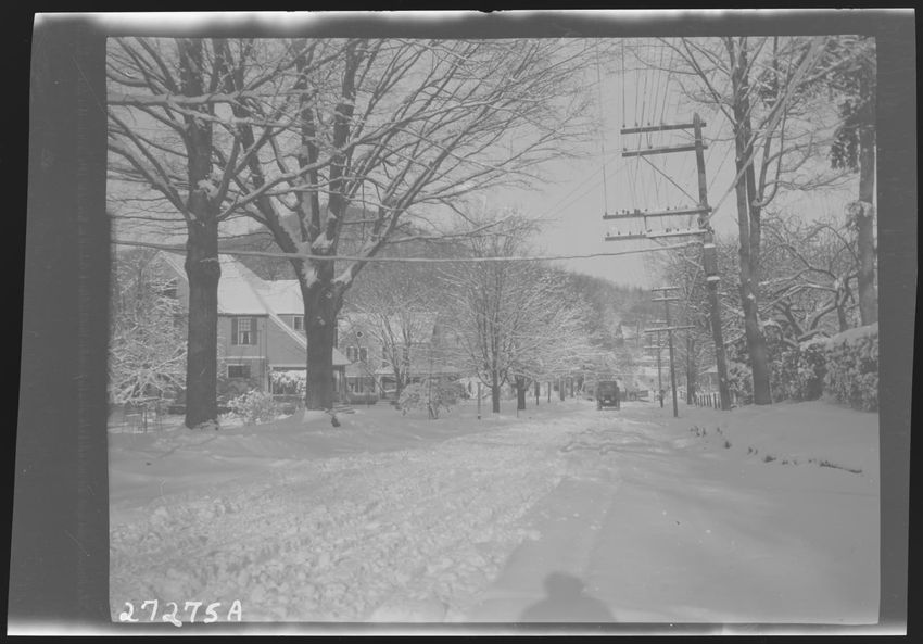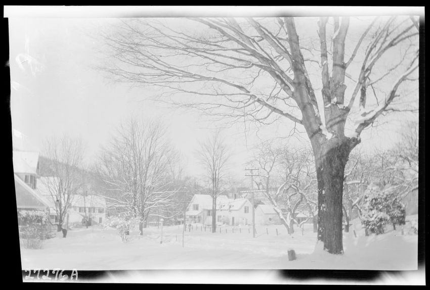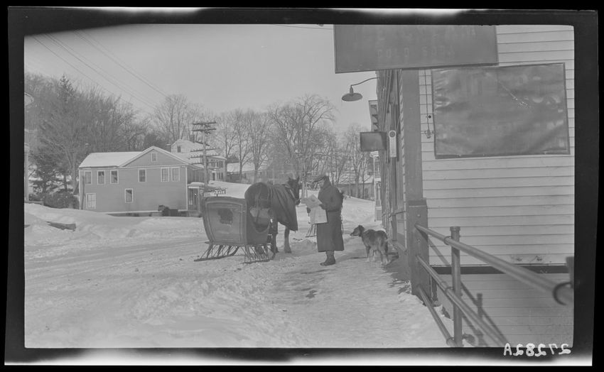 The image depicts a snowy scene on Main Street in Enfield, Massachusetts. A person stands near a horse-drawn sleigh, reading a newspaper, accompanied by a dog. Buildings line the street, and signs are visible, including one for "Ice Cream" and "Cold Soda." Snow covers the ground and rooftops, while ...