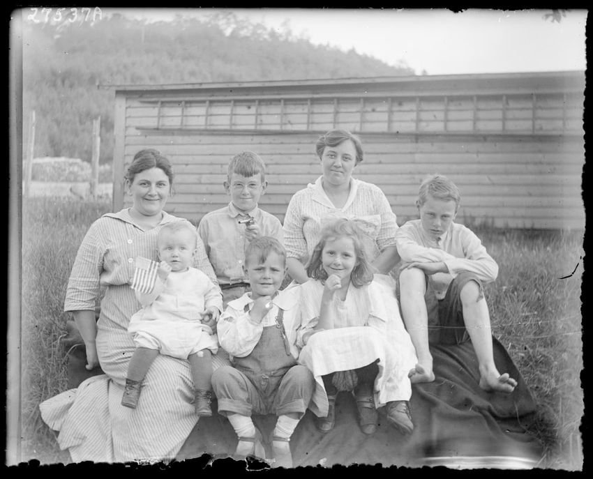 The image shows three children outdoors, posed in front of a leafy backdrop. On the left, a girl is standing, wearing a light-colored dress with a large bow in her hair. In the center, a younger child sits holding a small object. On the right, a boy in a suit is seated, with short hair and round gla...