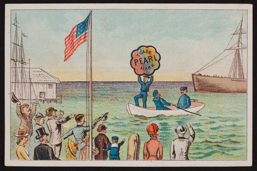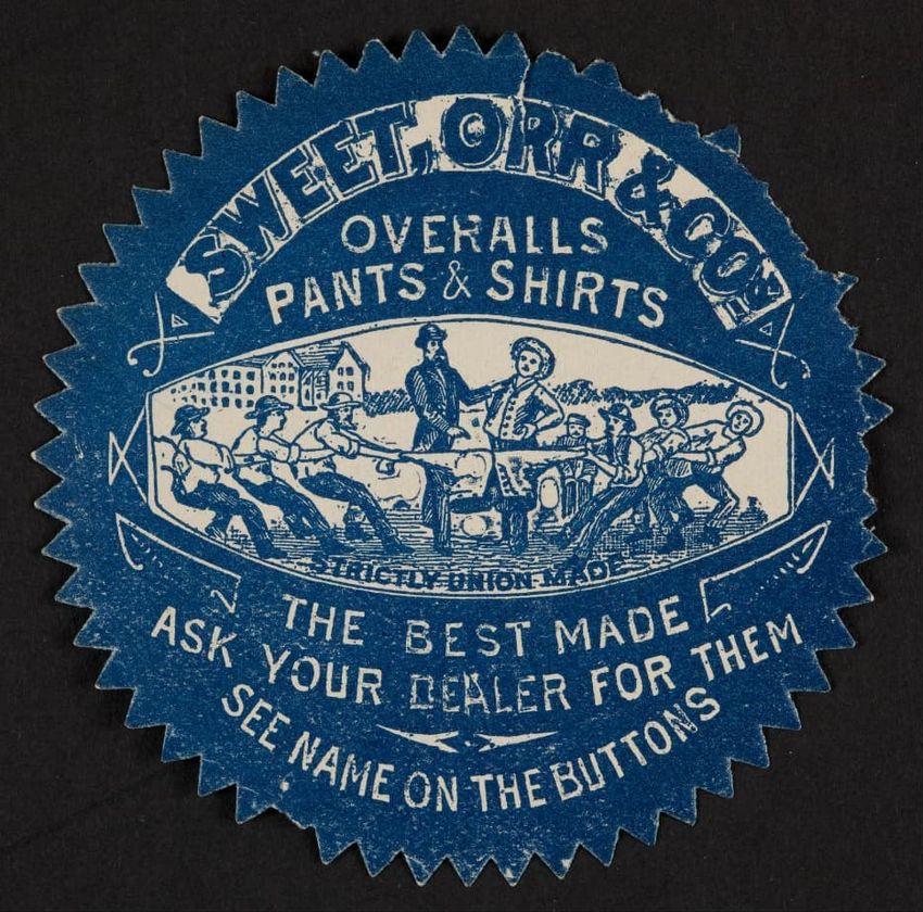 The item is a seal for the union made overalls, pants and shirts of Sweet, Orr and Company. The image is captioned "Strictly union made." Underneath the image the text reads "The best made. Ask your dealer for them. See name on the buttons."