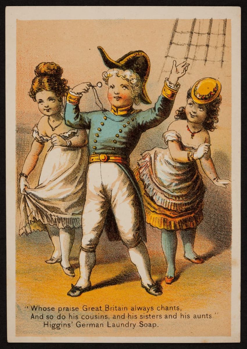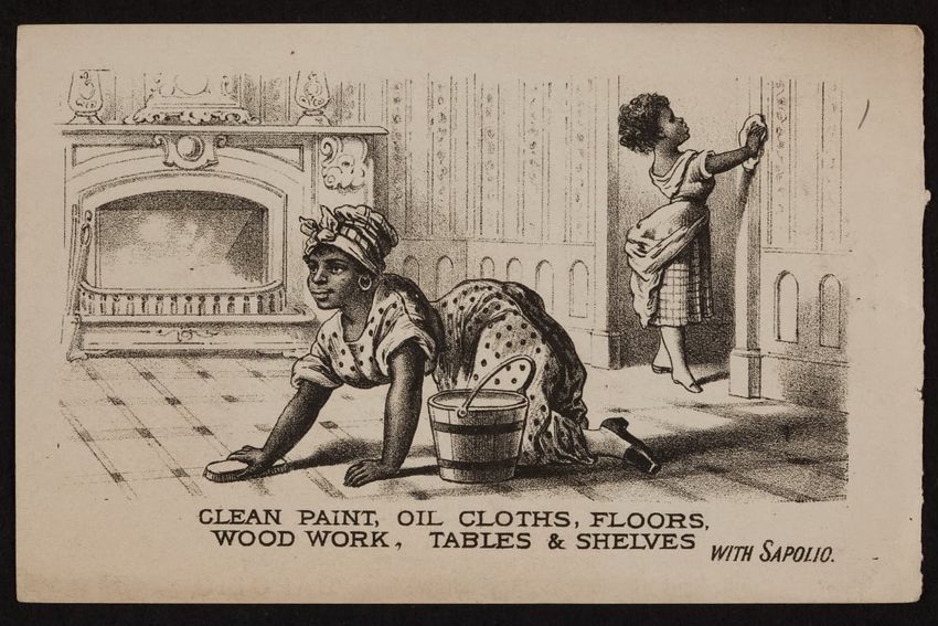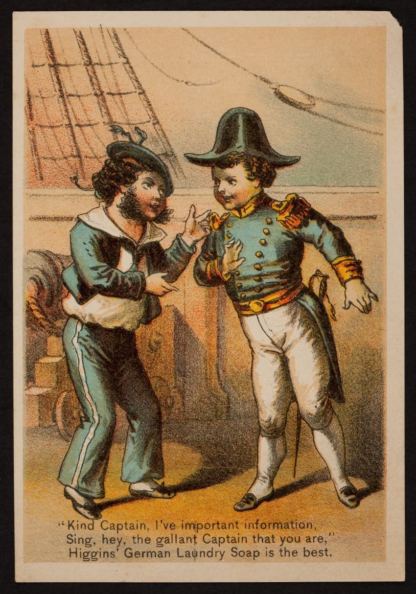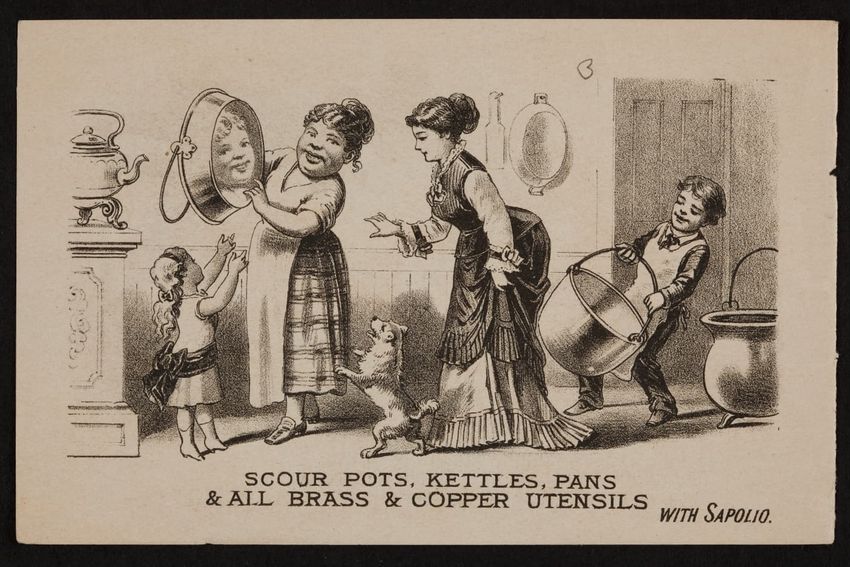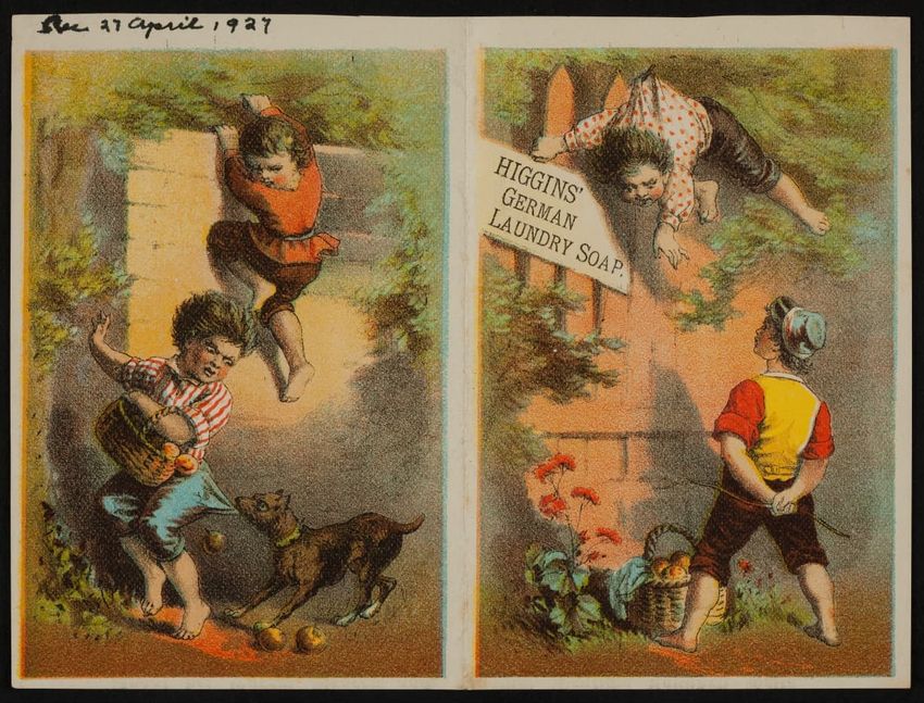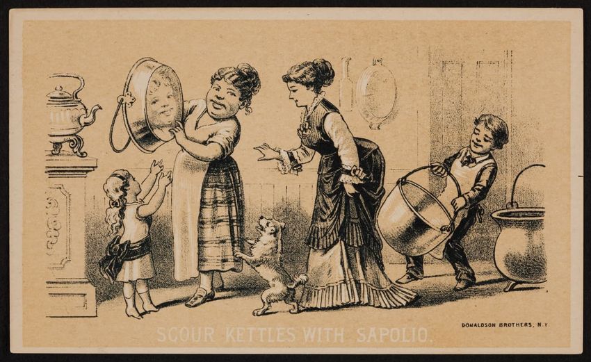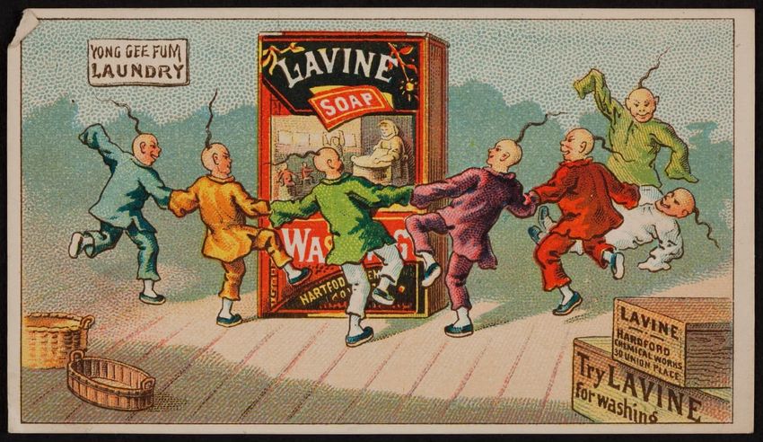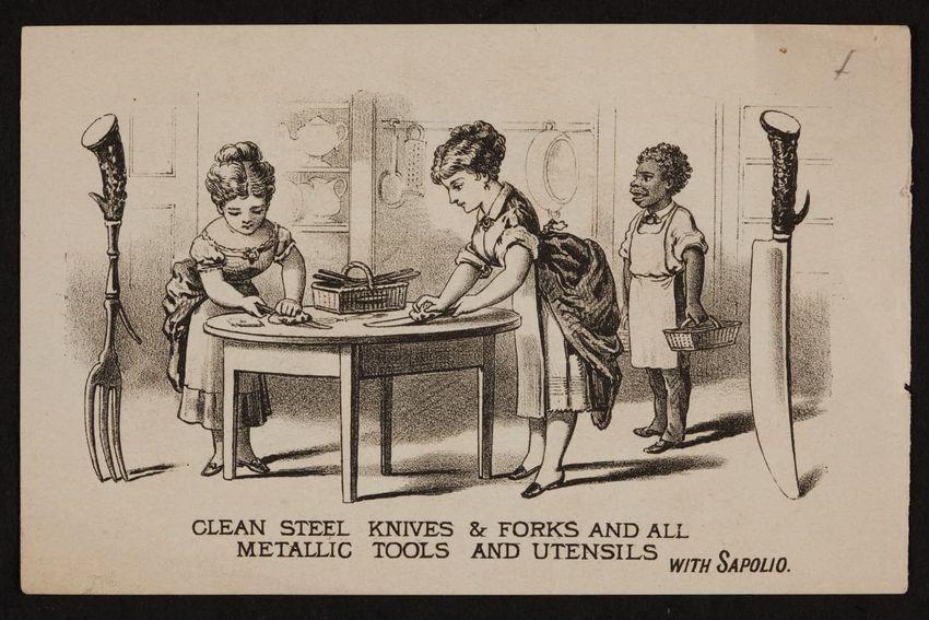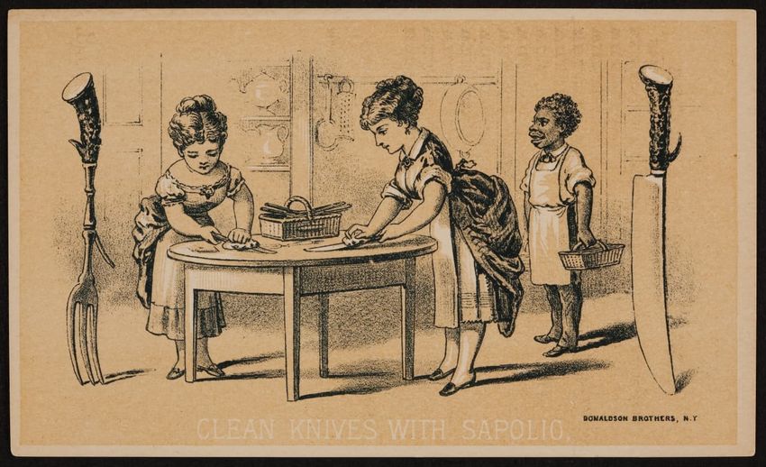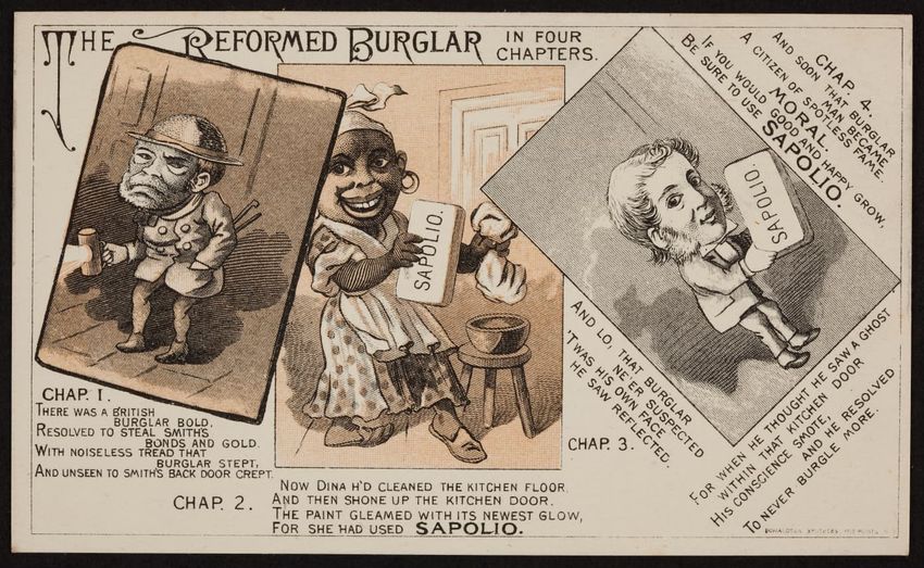 This trade card contains harmful language, imagery, and employs racist stereotypes.