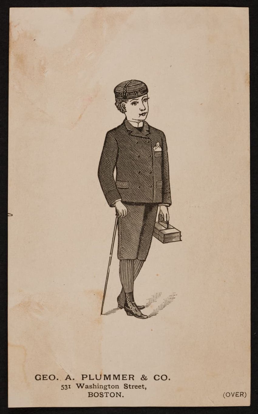 The card verso describes the store which carries men's boys' and children's clothing and is located opposite the Old South Church.
