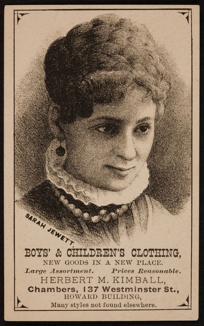 The card reads "new goods in a new place" and is located in the Howard Building. The image is captioned "Sarah Jewett."