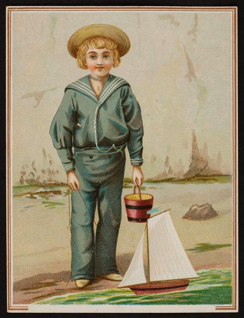 A young boy, dressed in a blue sailor suit, stands at the water's edge holding a pail and a toy sailboat on a string.