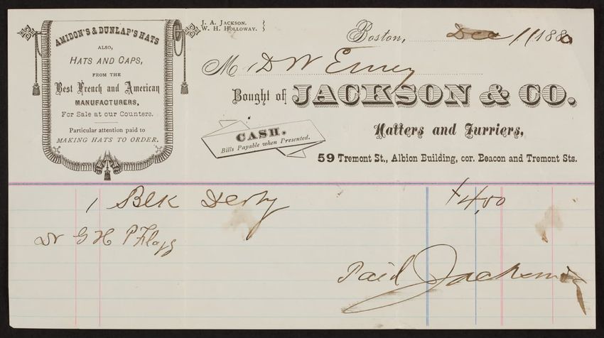 Jackson is located in the Albion Building and deals in Amidon's & Dunlap's Hats and hats and caps from French and American manufacturers.
