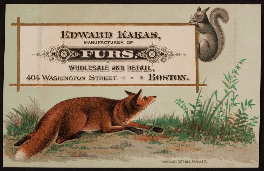 Edward Kakas & Sons deals in wholesale and retail furs. The bottom of the card reads "Copyright 1877 by L. Prang & Co."
