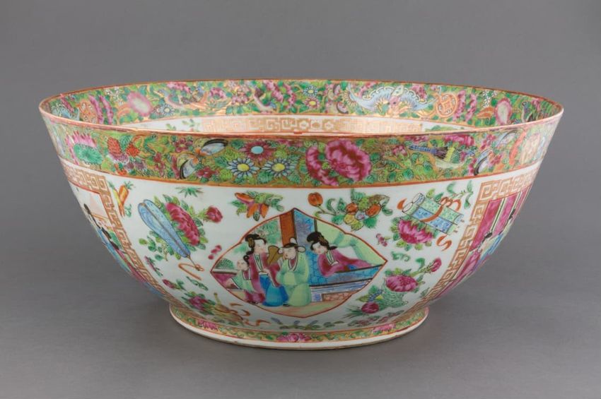 Oval, porcelain enameled platter with green tendrils, pink peonies, and butterflies around six medallions depicting figures engaged in various activities and birds, insects, and flowers. A central circular medallion depicts a floral decoration. This design is sometimes known as Rose Medallion.