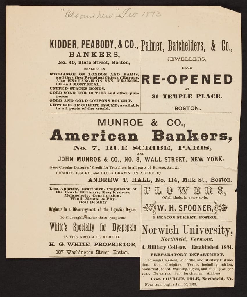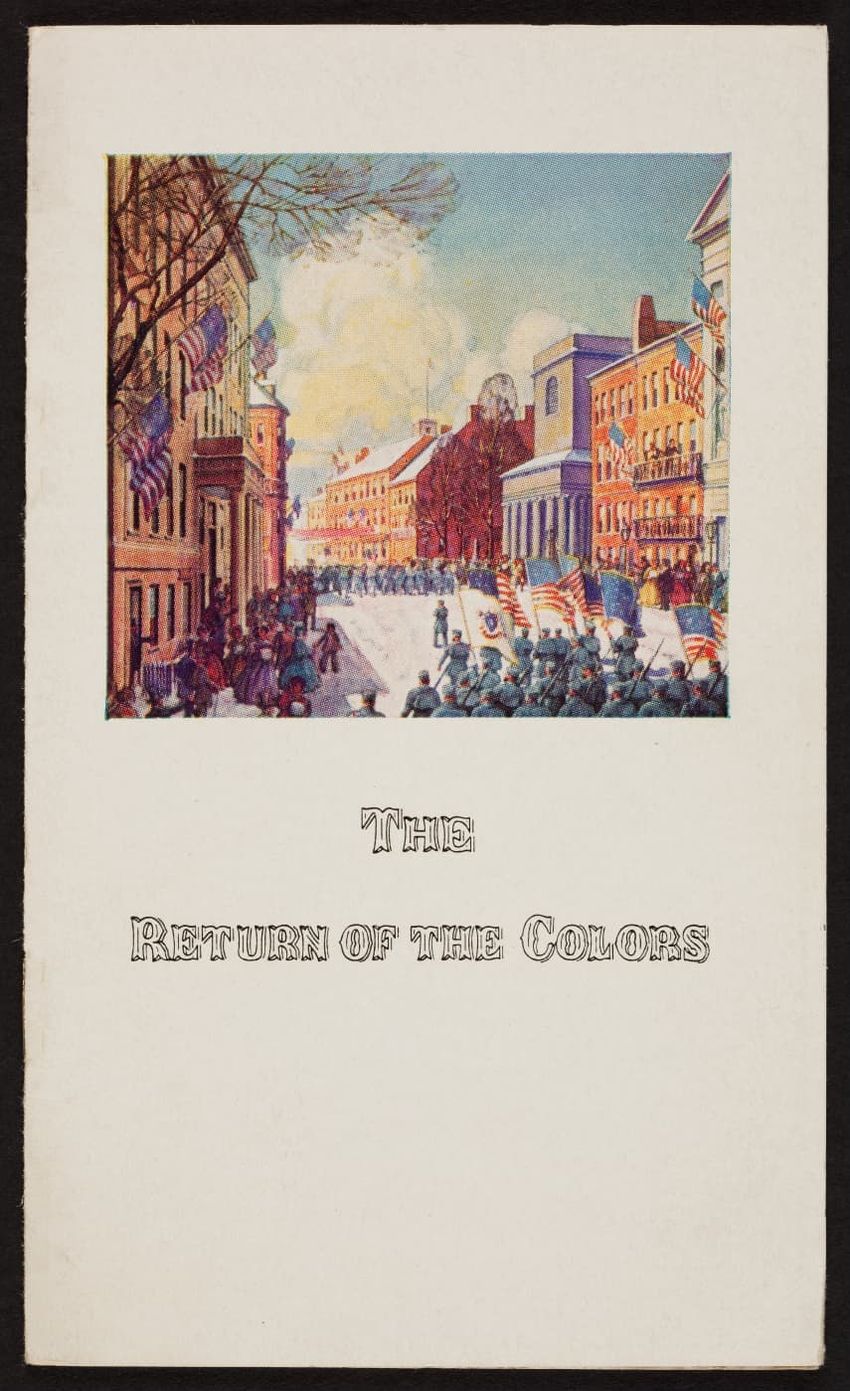 The pamphlet contains an article, from the Boston Daily Advertiser, December 23, 1865, describing the return of the Massachusetts regiments and batteries to Boston. The bank used this event as the basis for its 1938 calendar. The bank location is given as diagonally across from King's Chapel.