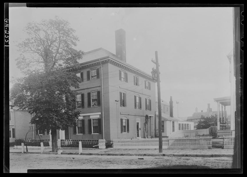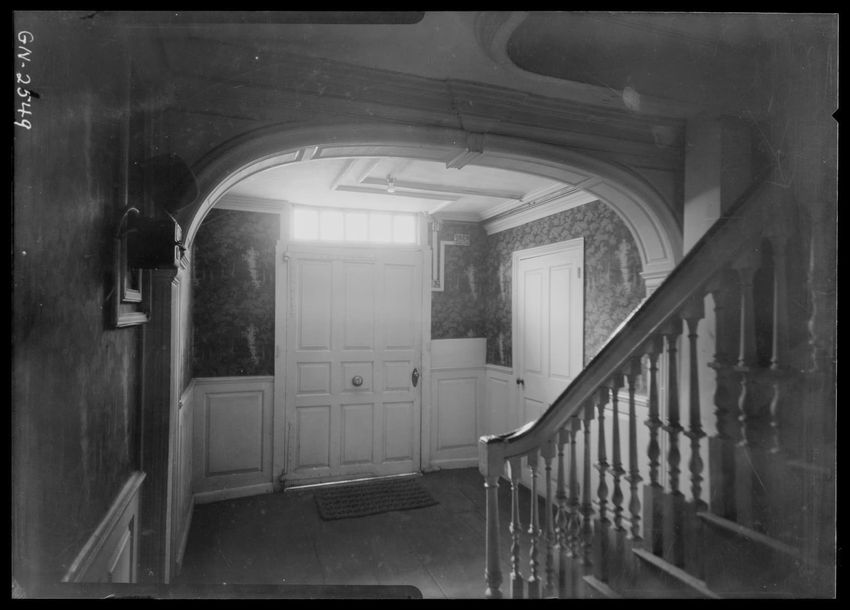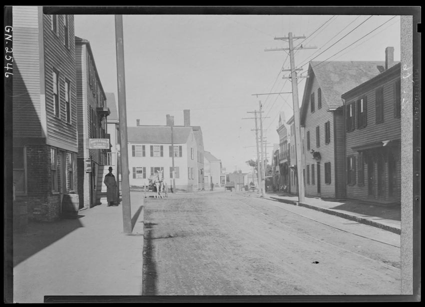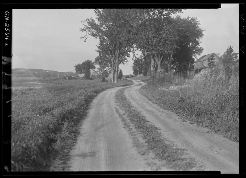 The image shows a dirt road in Newbury, Massachusetts, lined with tall trees on either side. On the right side, there is a house partially visible, and grassy fields stretch into the distance. The road curves gently, disappearing into the background.