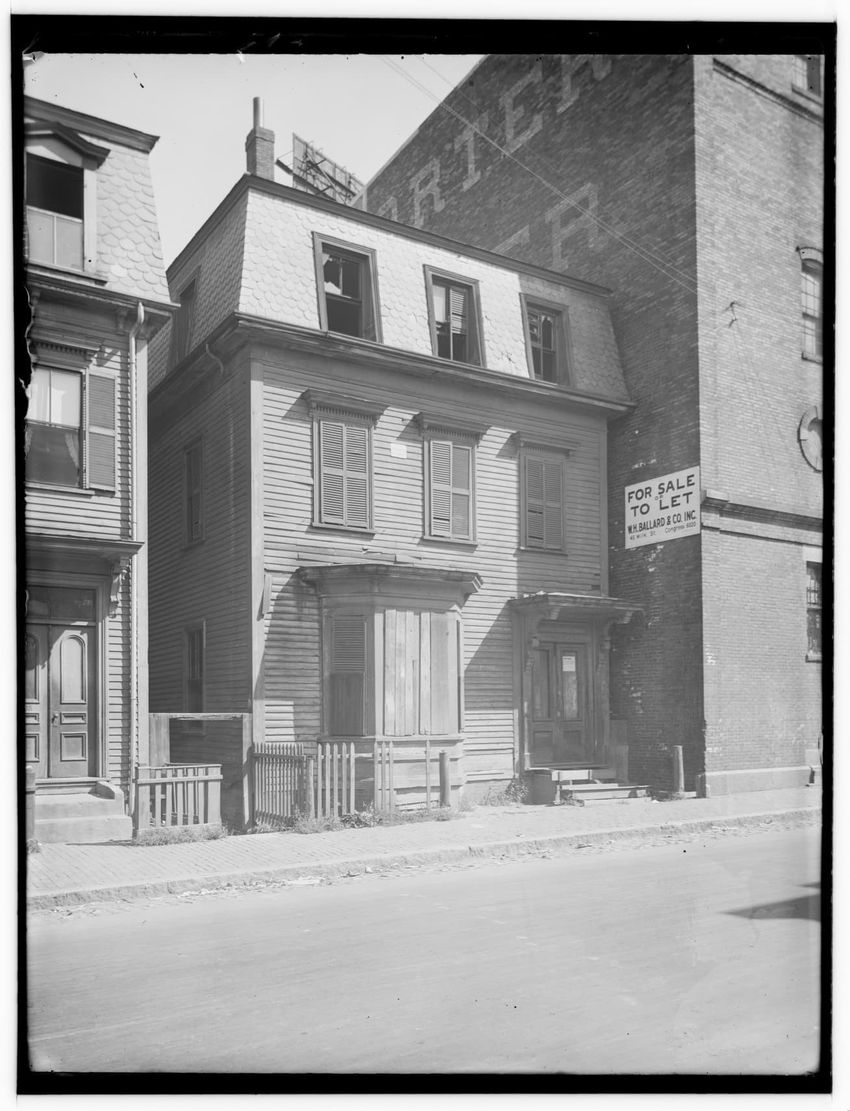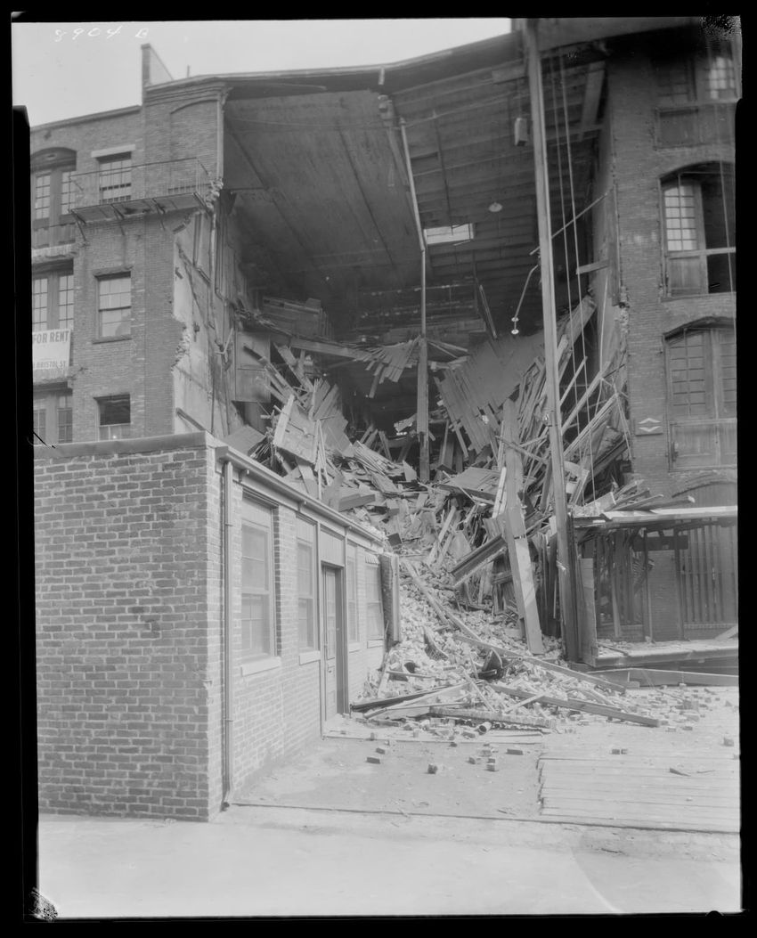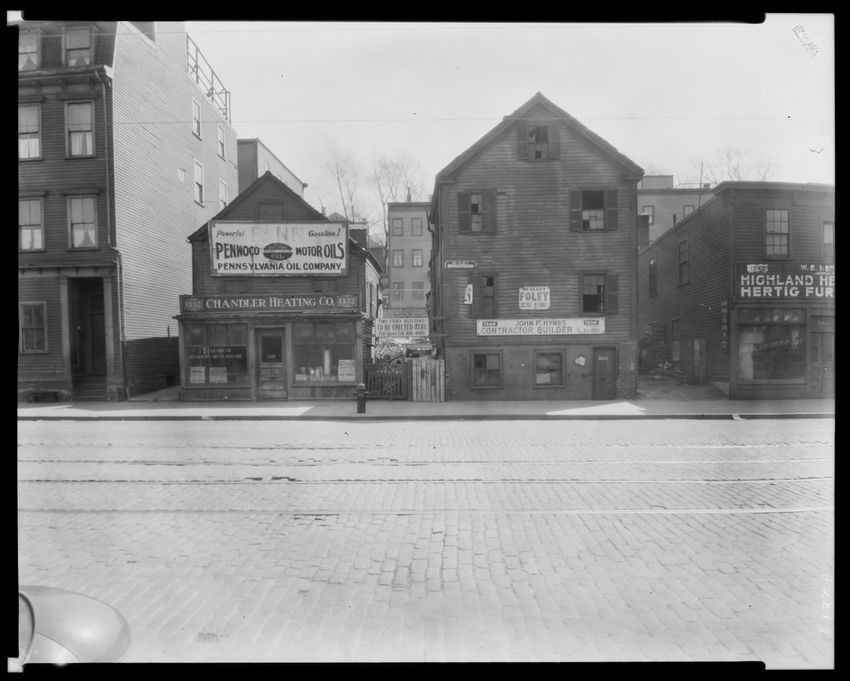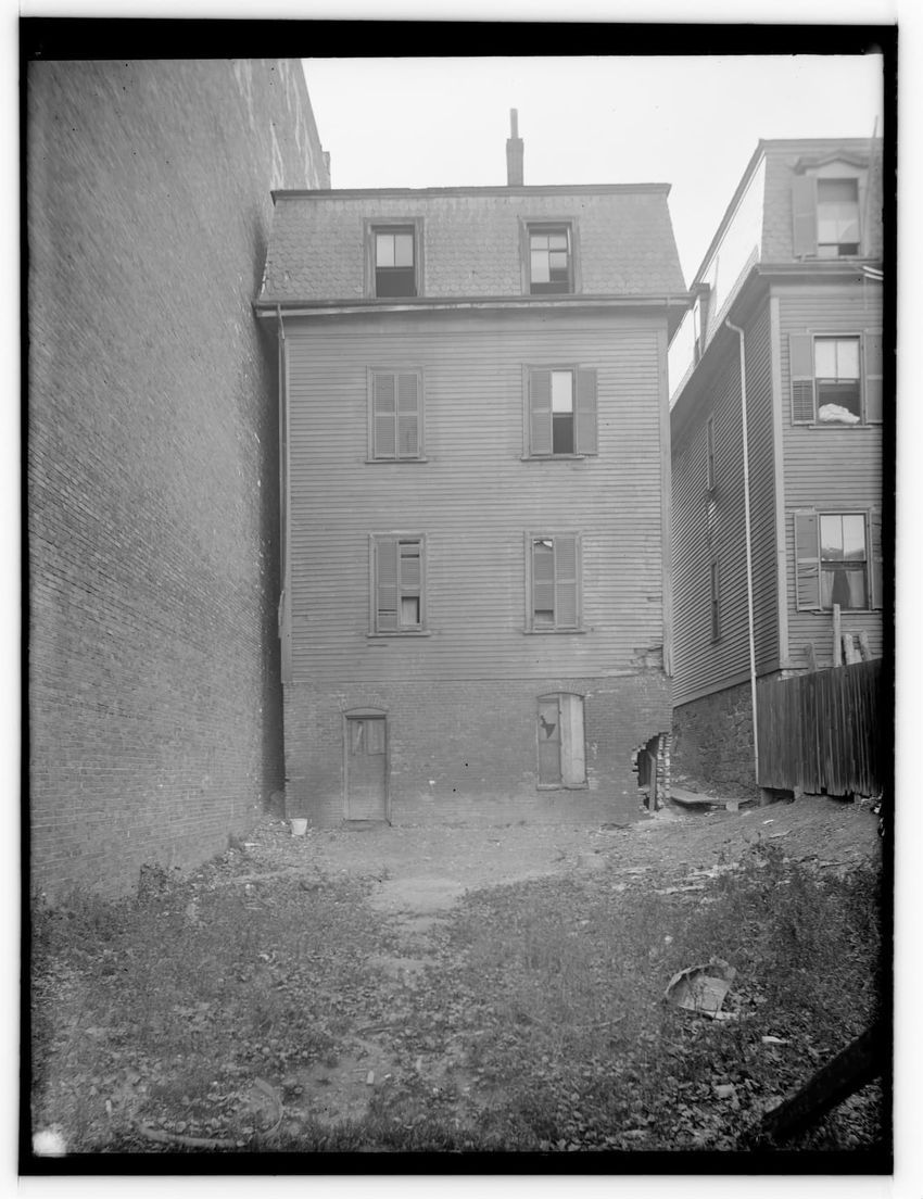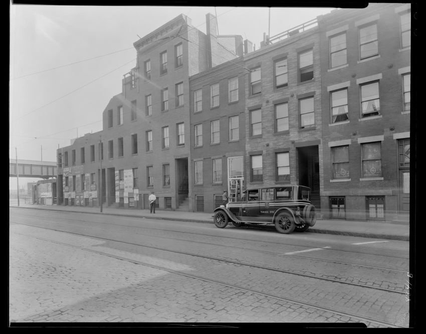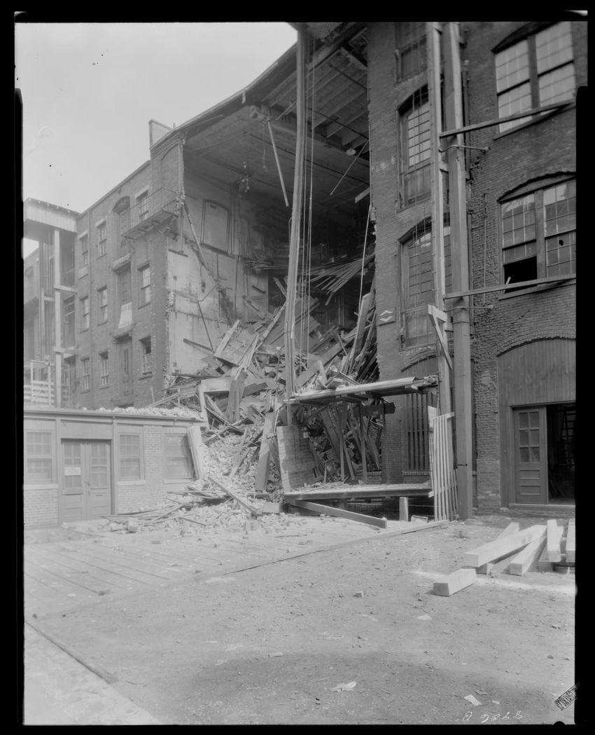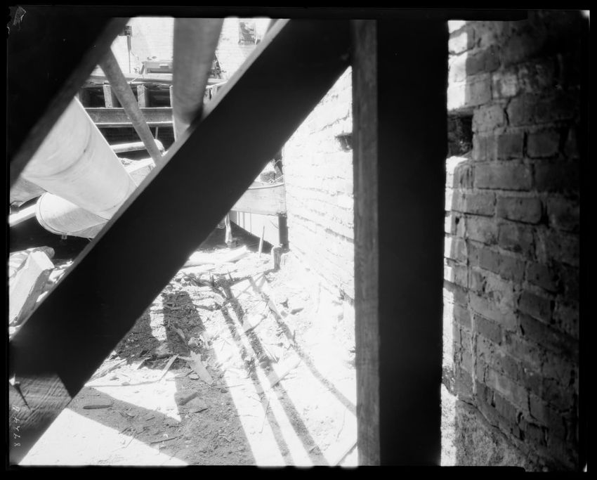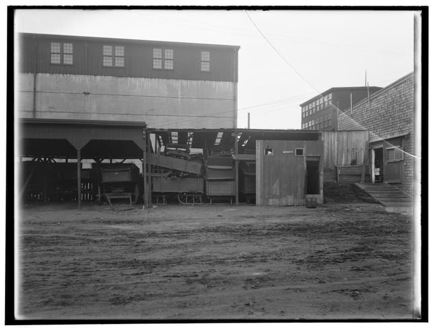 The image shows an outdoor industrial area on Medford Street, Boston, Massachusetts. In the foreground, there are several horse-drawn carts parked under a shelter. The background features large wooden and brick buildings, with visible windows and a corrugated roof. Piles of material and additional s...