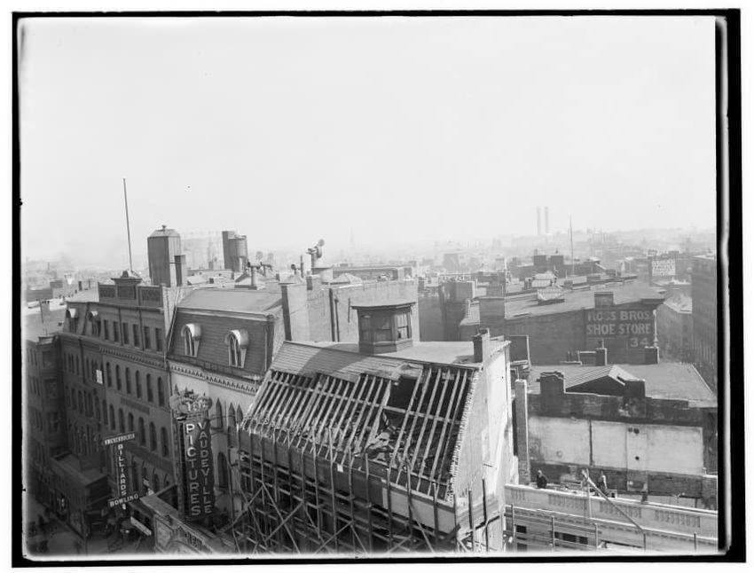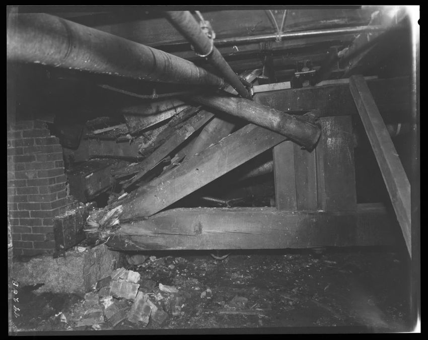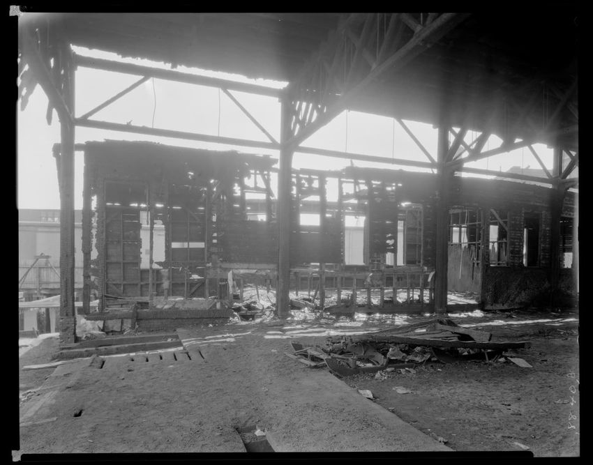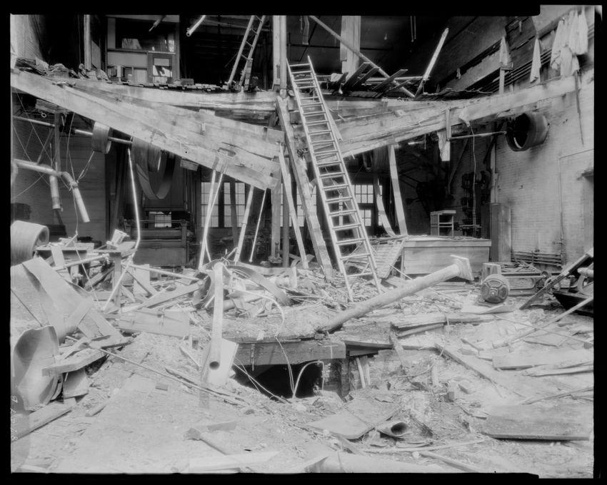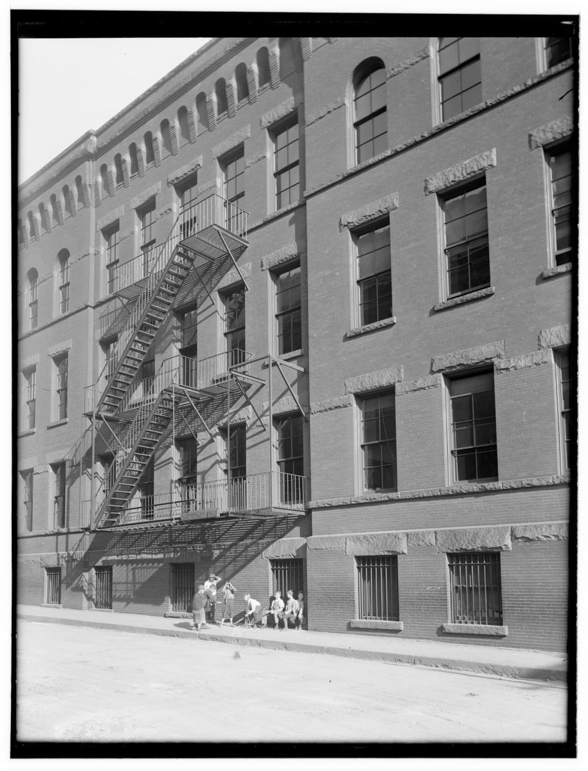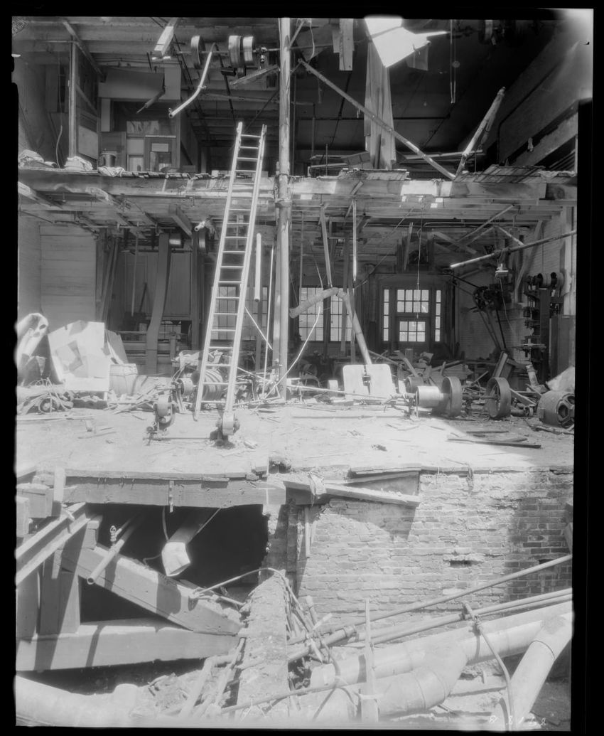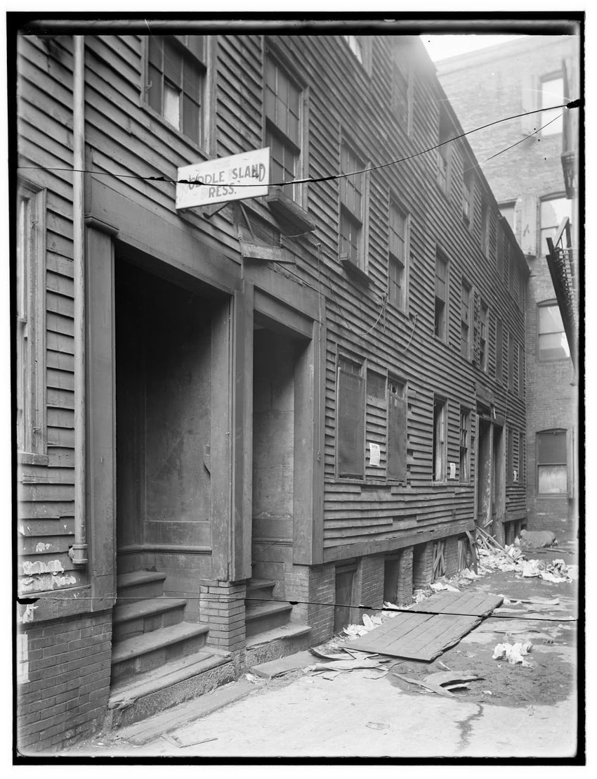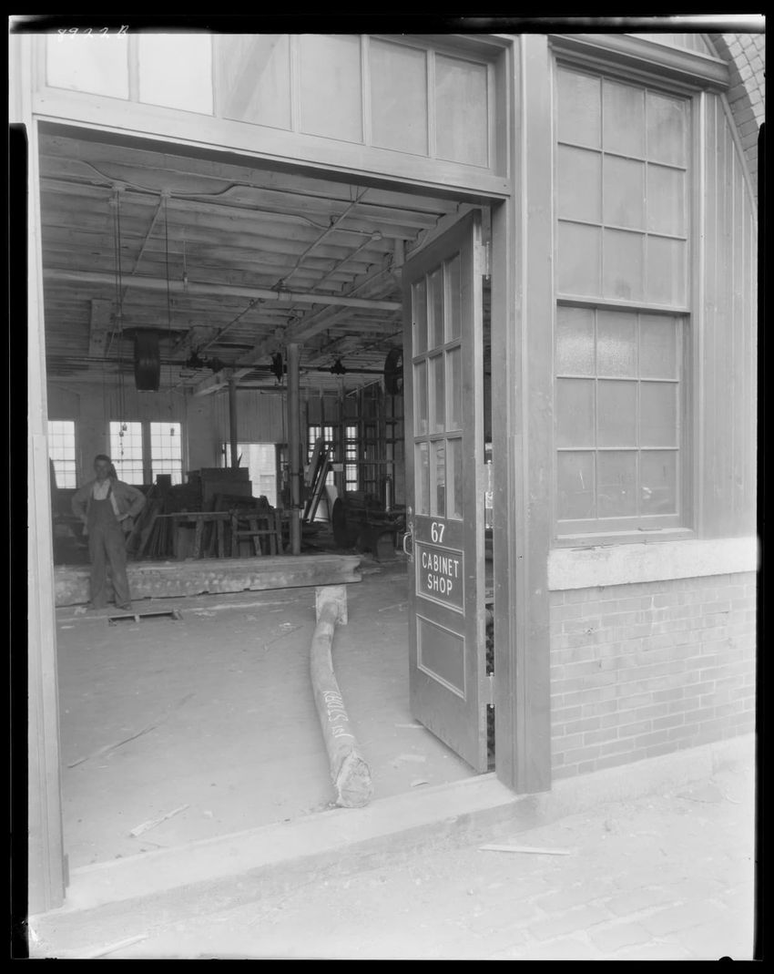The image shows an outdoor industrial area on Medford Street, Boston, Massachusetts. In the foreground, there are several horse-drawn carts parked under a shelter. The background features large wooden and brick buildings, with visible windows and a corrugated roof. Piles of material and additional s...
