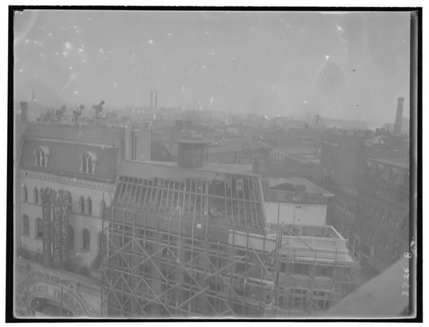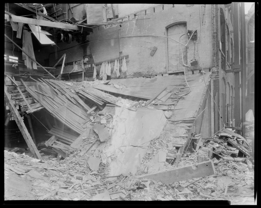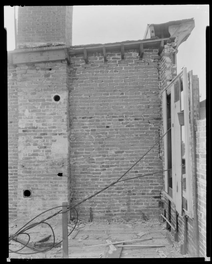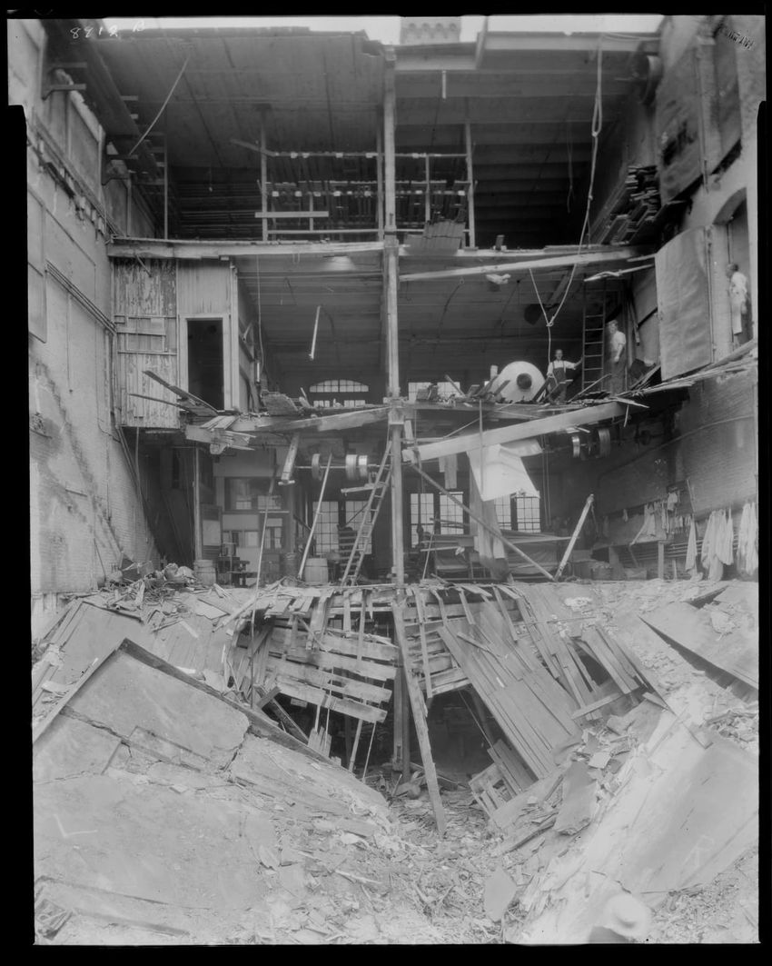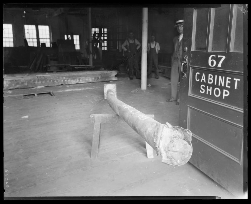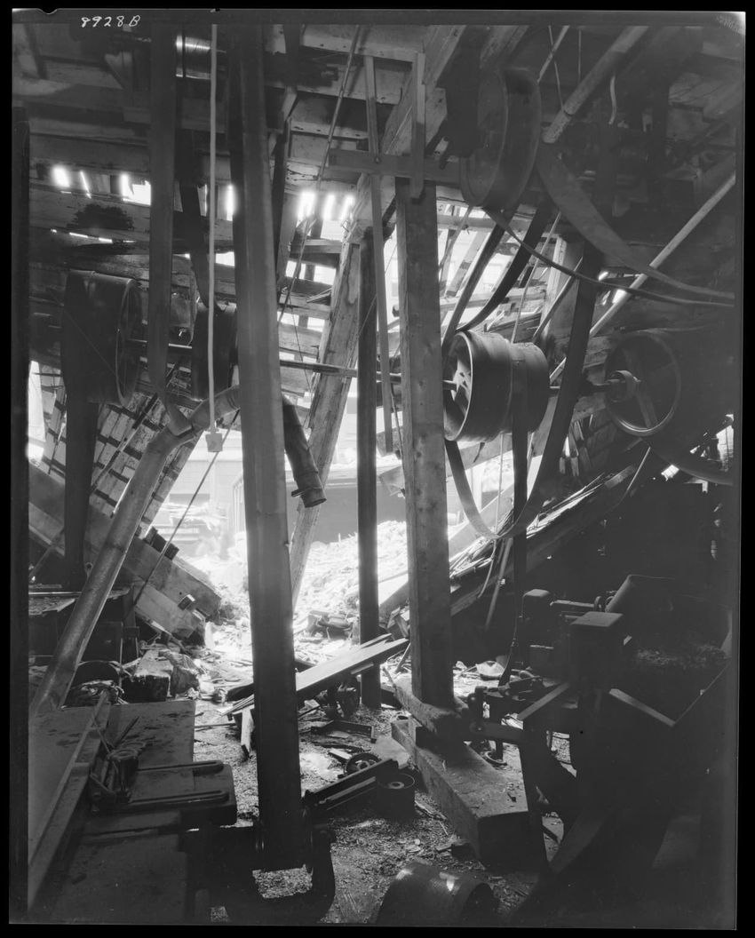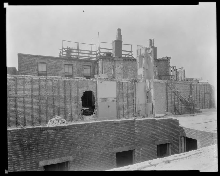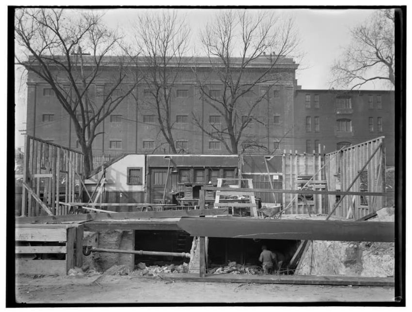 The image shows an outdoor industrial area on Medford Street, Boston, Massachusetts. In the foreground, there are several horse-drawn carts parked under a shelter. The background features large wooden and brick buildings, with visible windows and a corrugated roof. Piles of material and additional s...