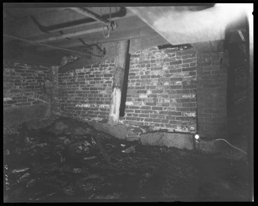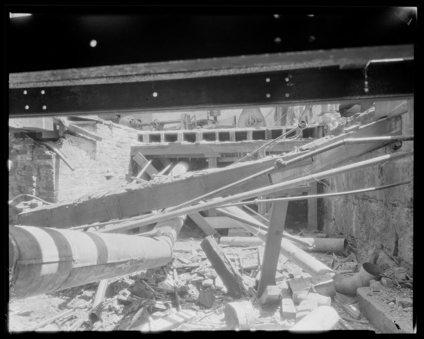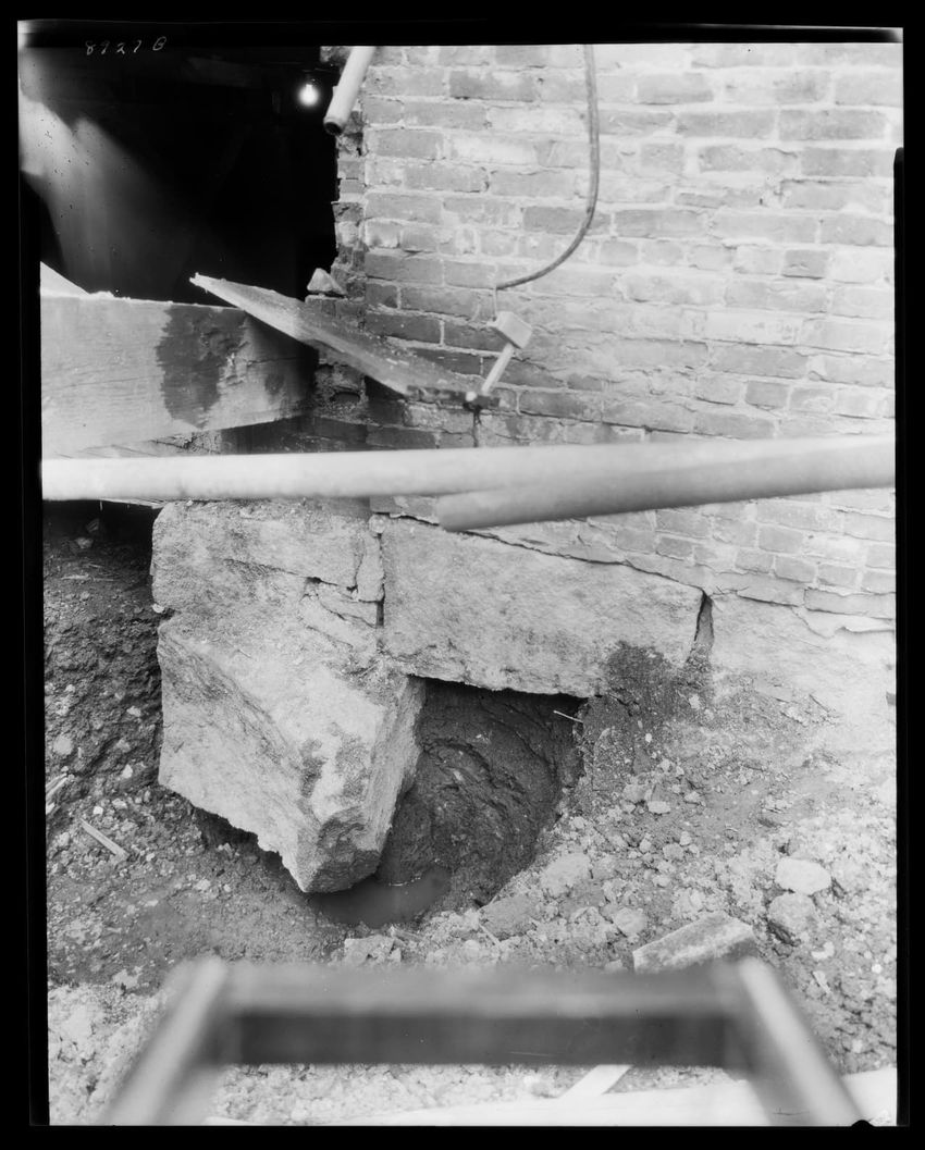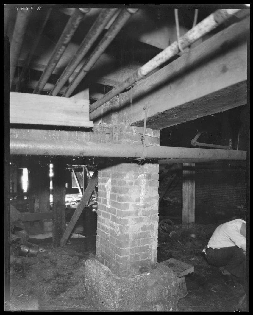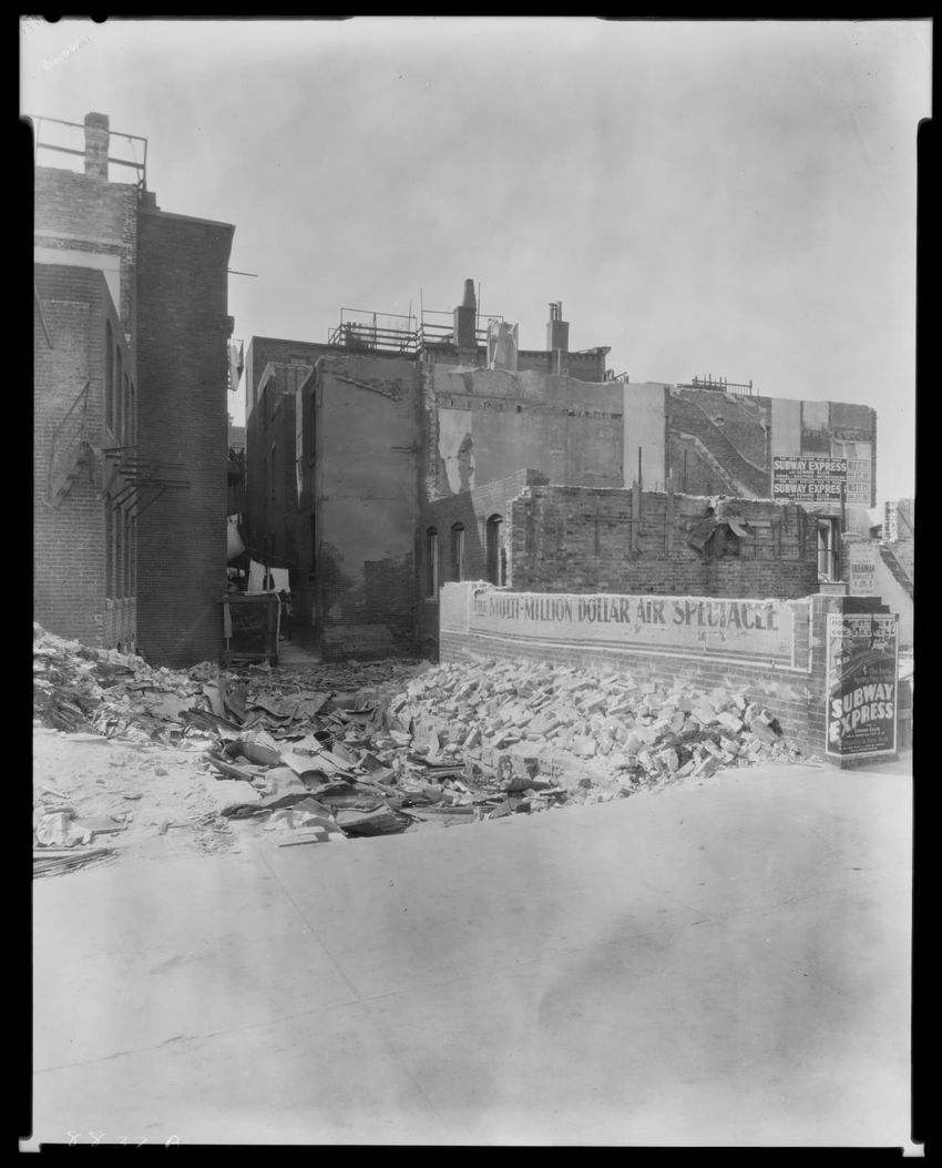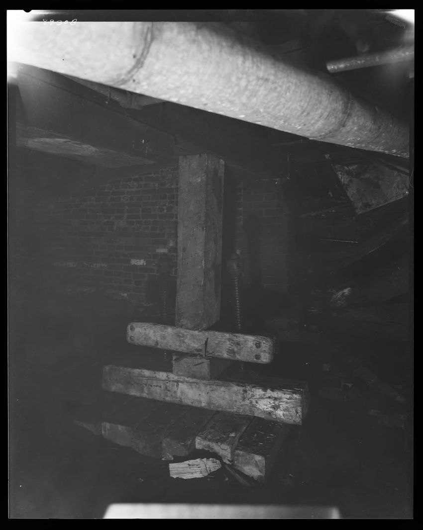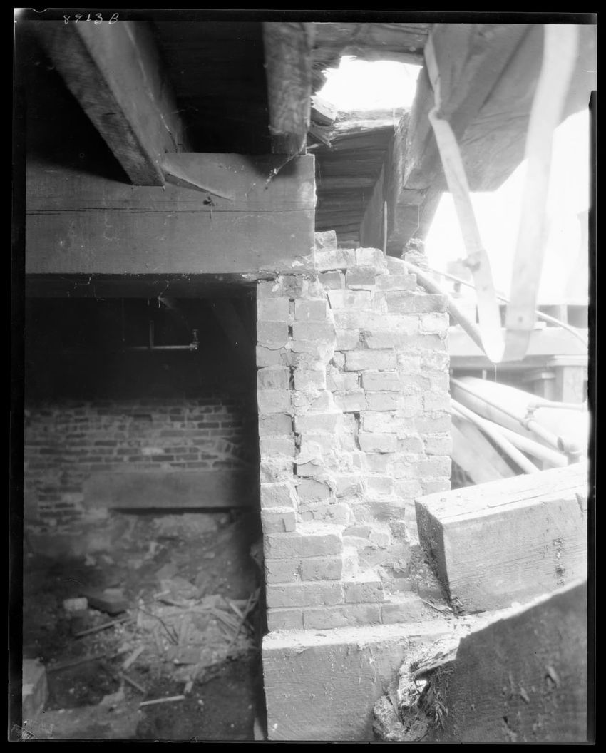 The image shows an outdoor industrial area on Medford Street, Boston, Massachusetts. In the foreground, there are several horse-drawn carts parked under a shelter. The background features large wooden and brick buildings, with visible windows and a corrugated roof. Piles of material and additional s...