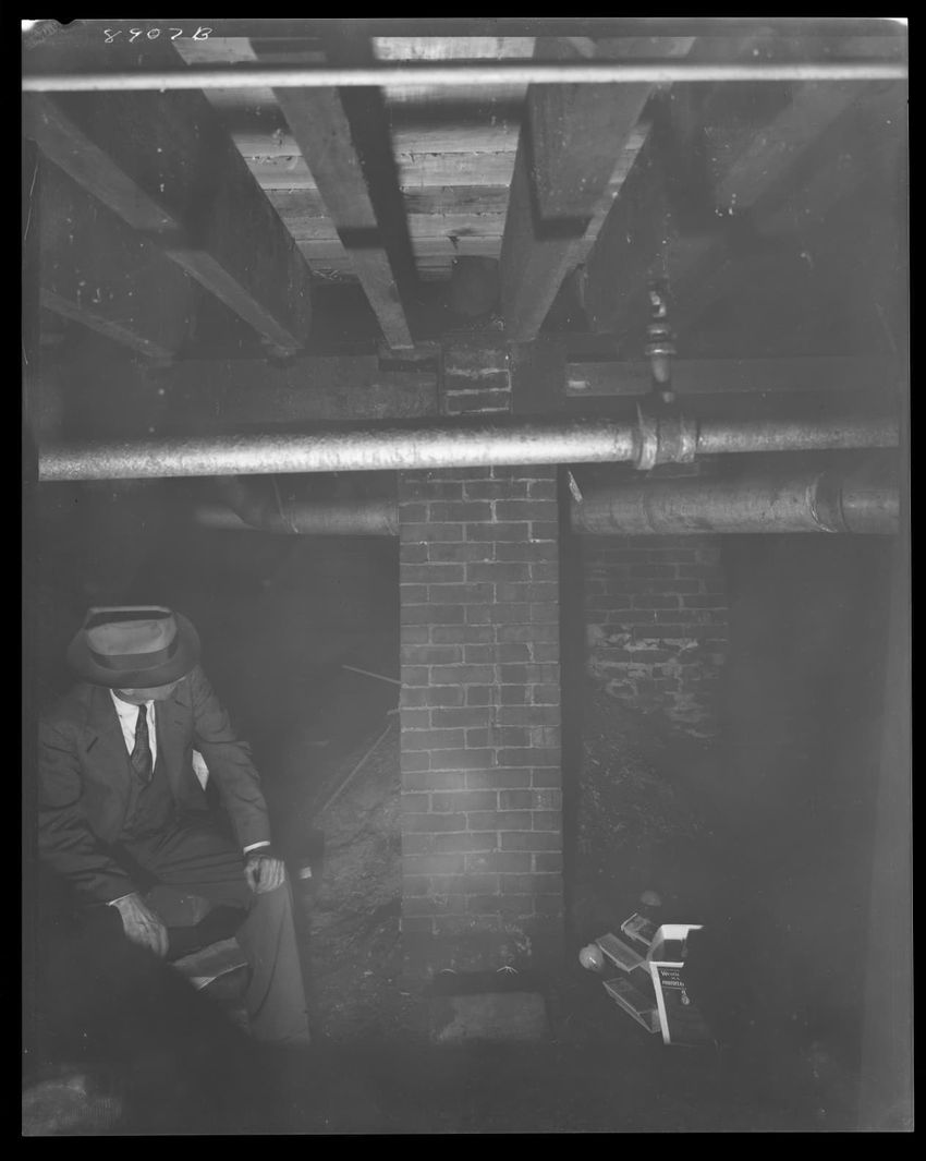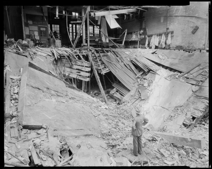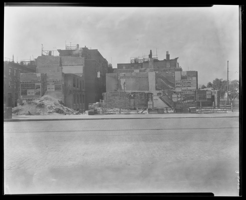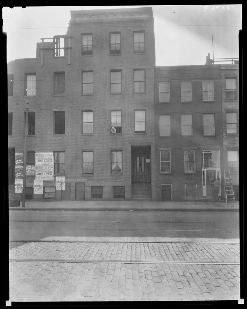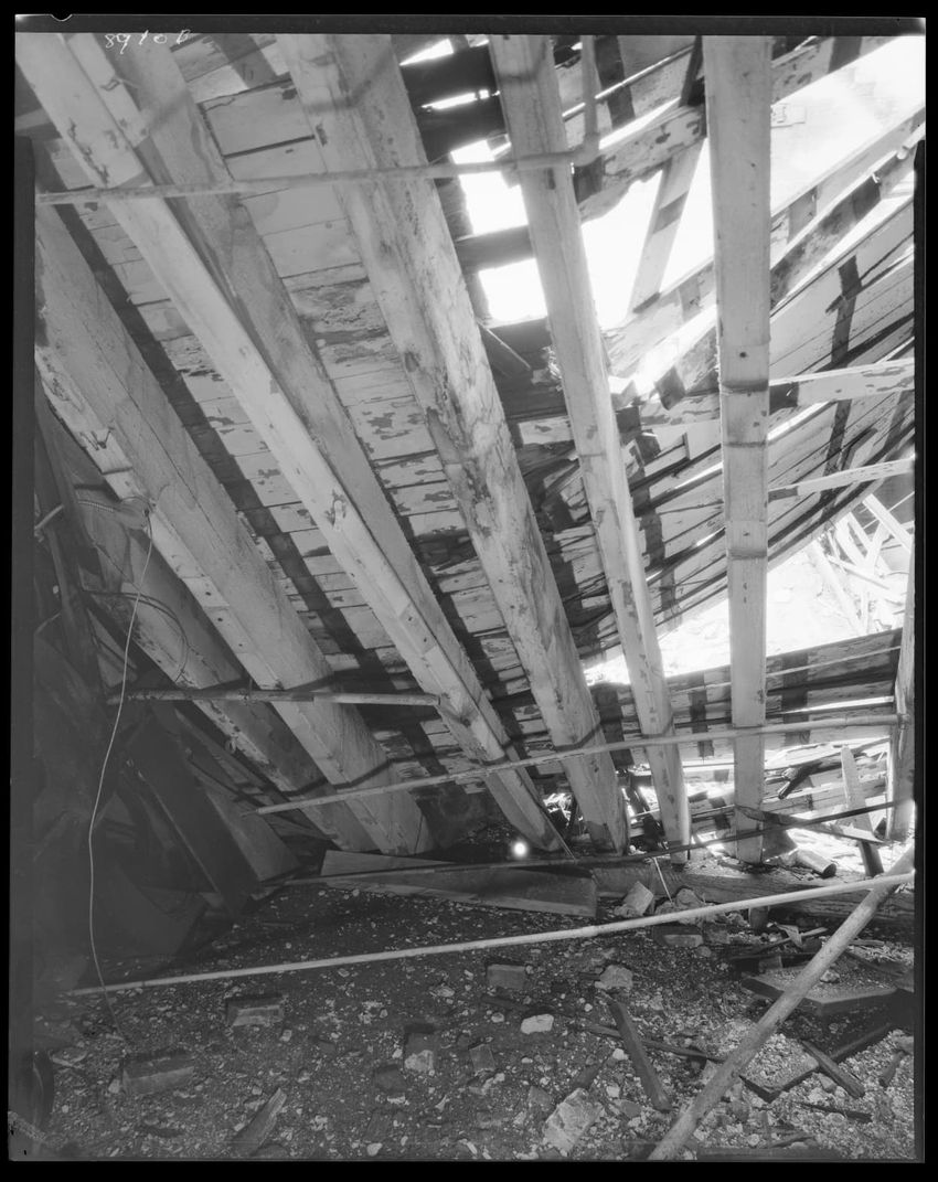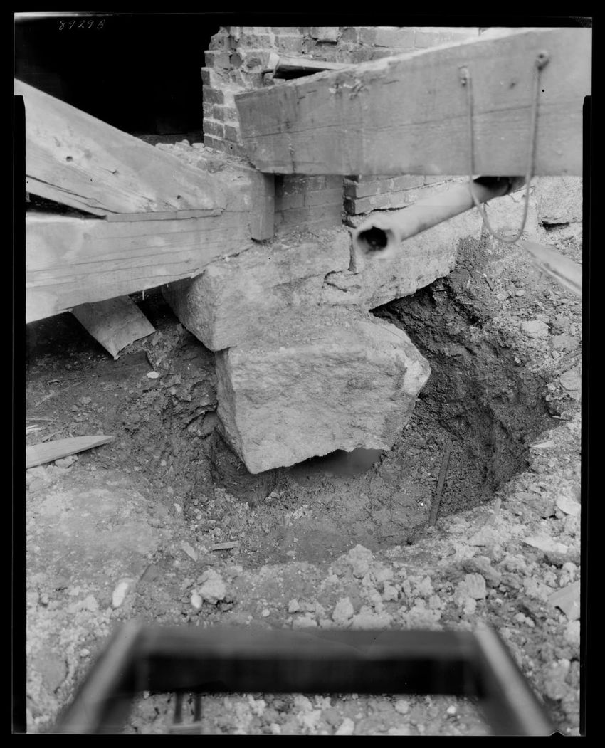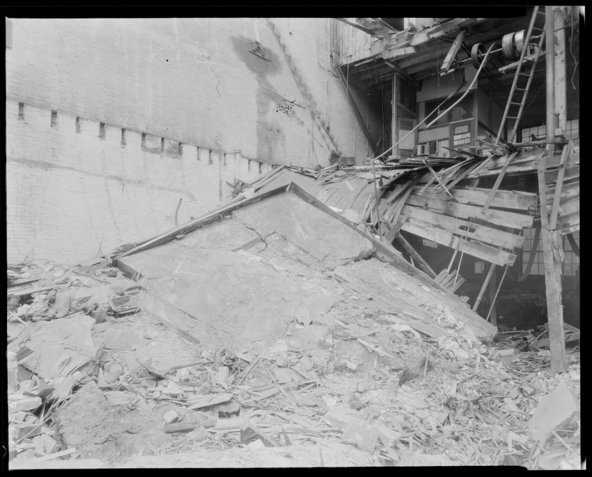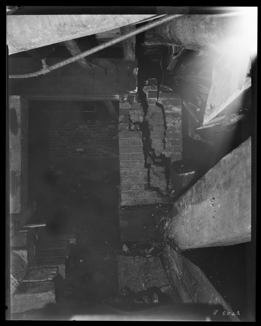 The image shows an outdoor industrial area on Medford Street, Boston, Massachusetts. In the foreground, there are several horse-drawn carts parked under a shelter. The background features large wooden and brick buildings, with visible windows and a corrugated roof. Piles of material and additional s...