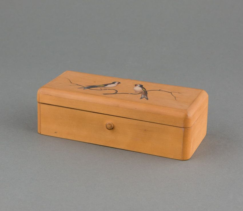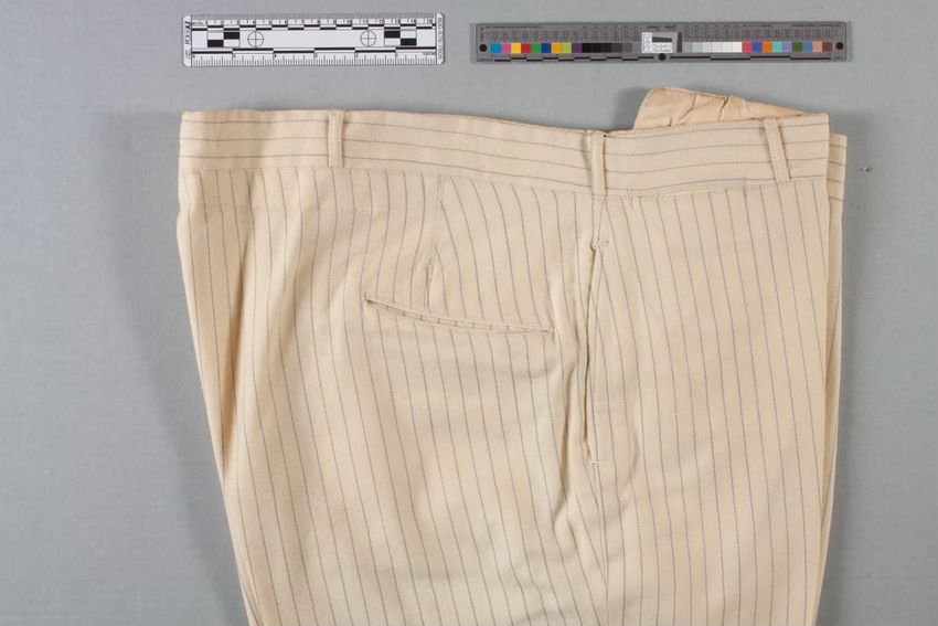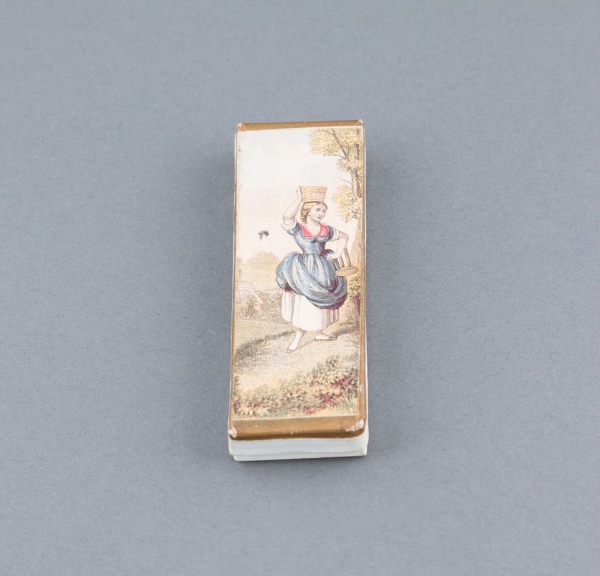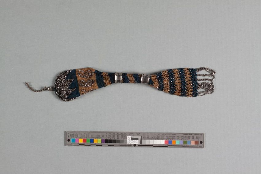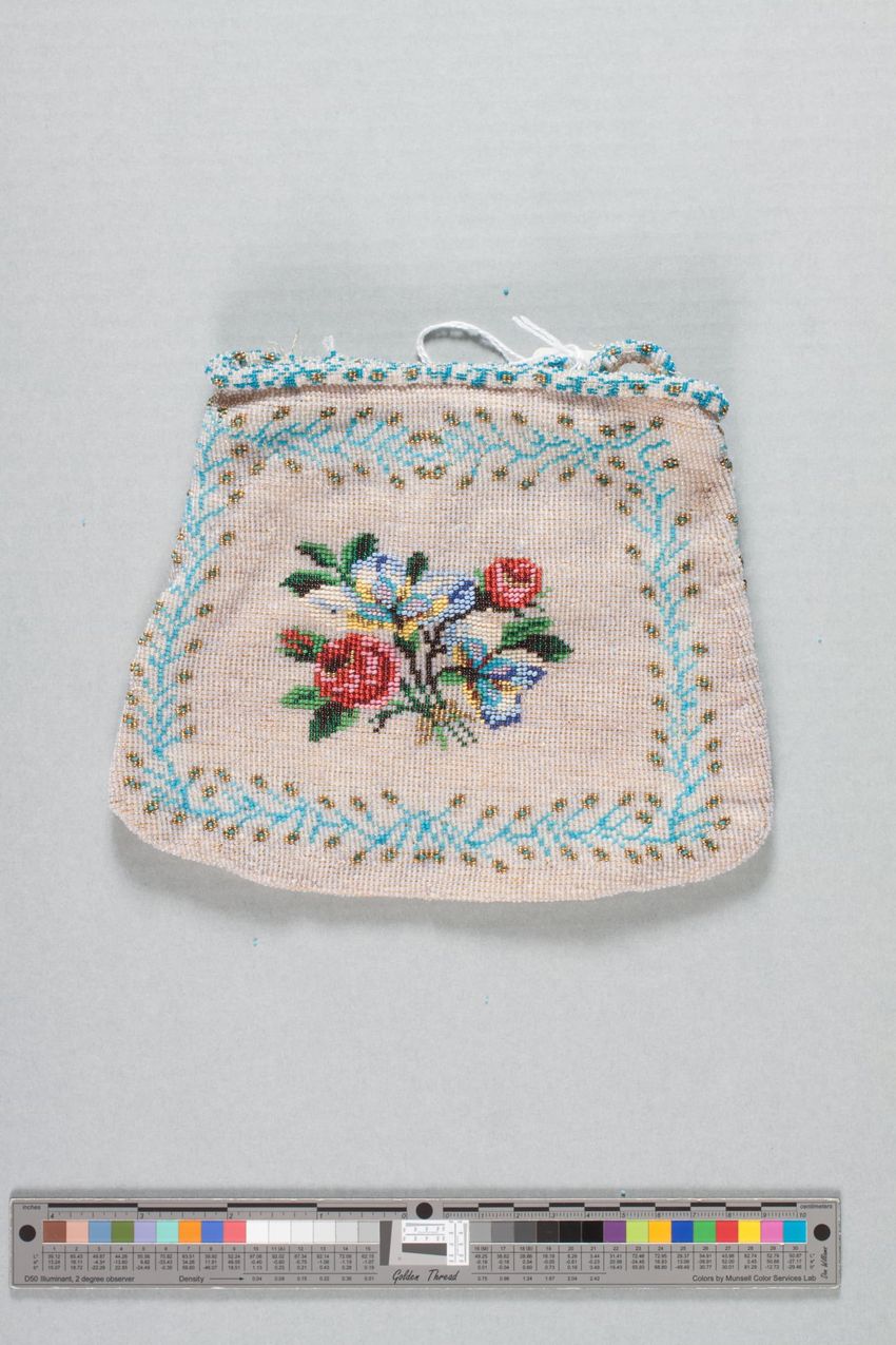 Small, natural straw bonnet with openwork straw brim and crown and brown velvet ties with bow. Brim and crown lined with pleated brown silk, and cream silk.