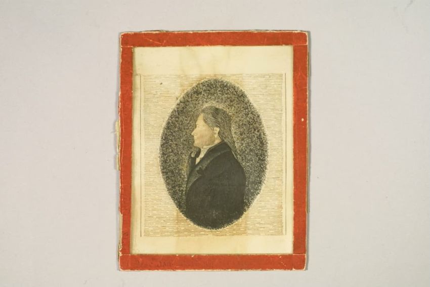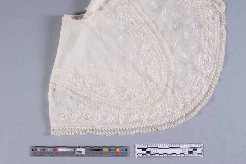 White waistcoat with vertical bands of raised ribbing; chevron band of silver thread with sequins along collar and front; Bows and garland at pseudo-pockets; High standing collar; single breasted with twelve buttons.