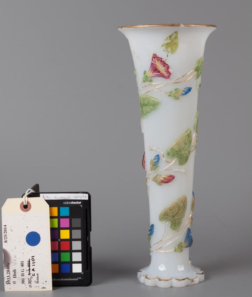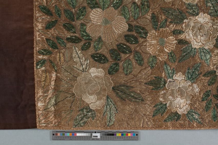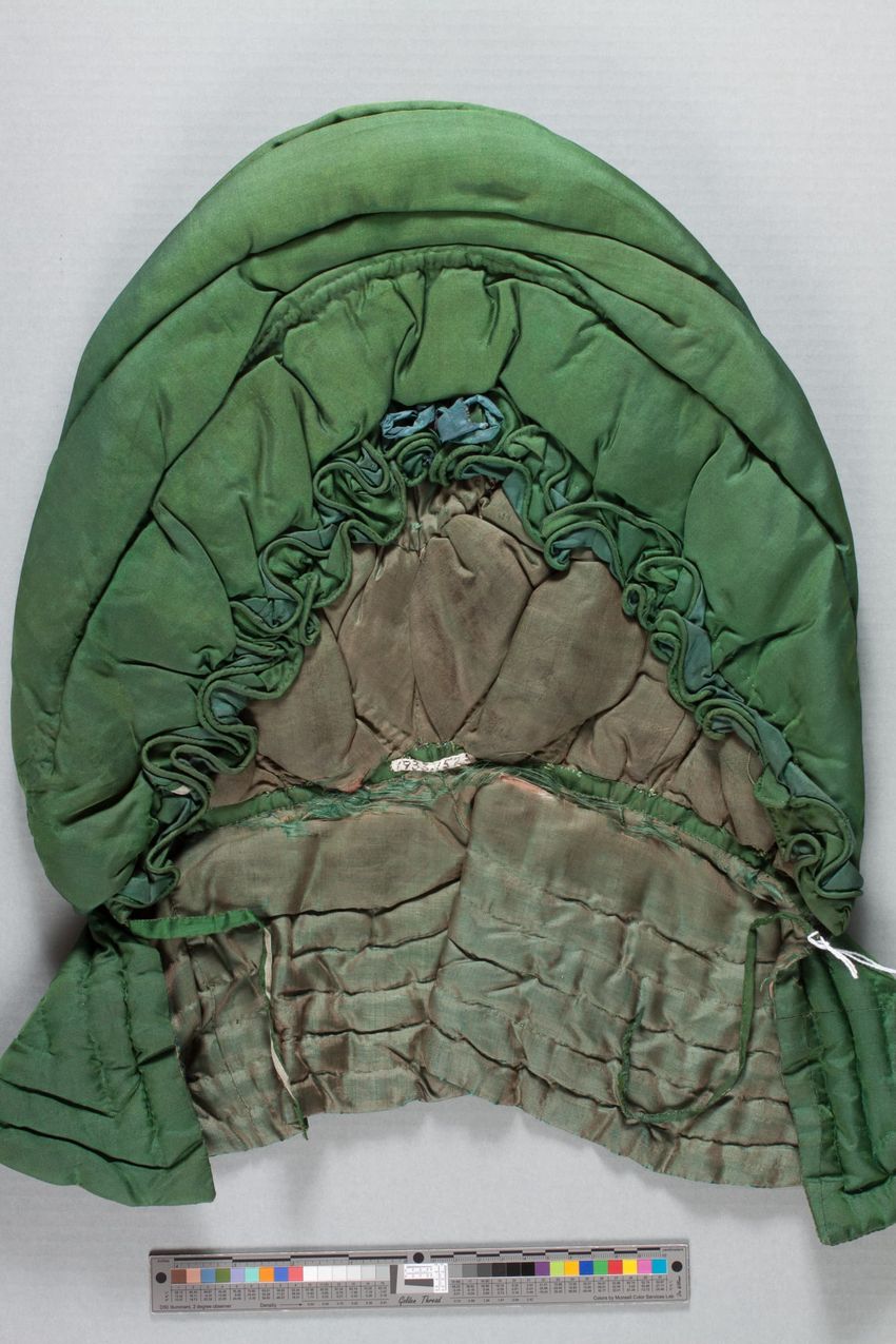Green silk twill, calash style with four cane hoops; double, piped ruffle at brim, with drawstring of blue silk ribbon; gathered at center back oval panel inserted at center back; wide neck ruffle, quilted with horizontal bands, and lined with down; fully lined with green iridescent silk; narrow gre...