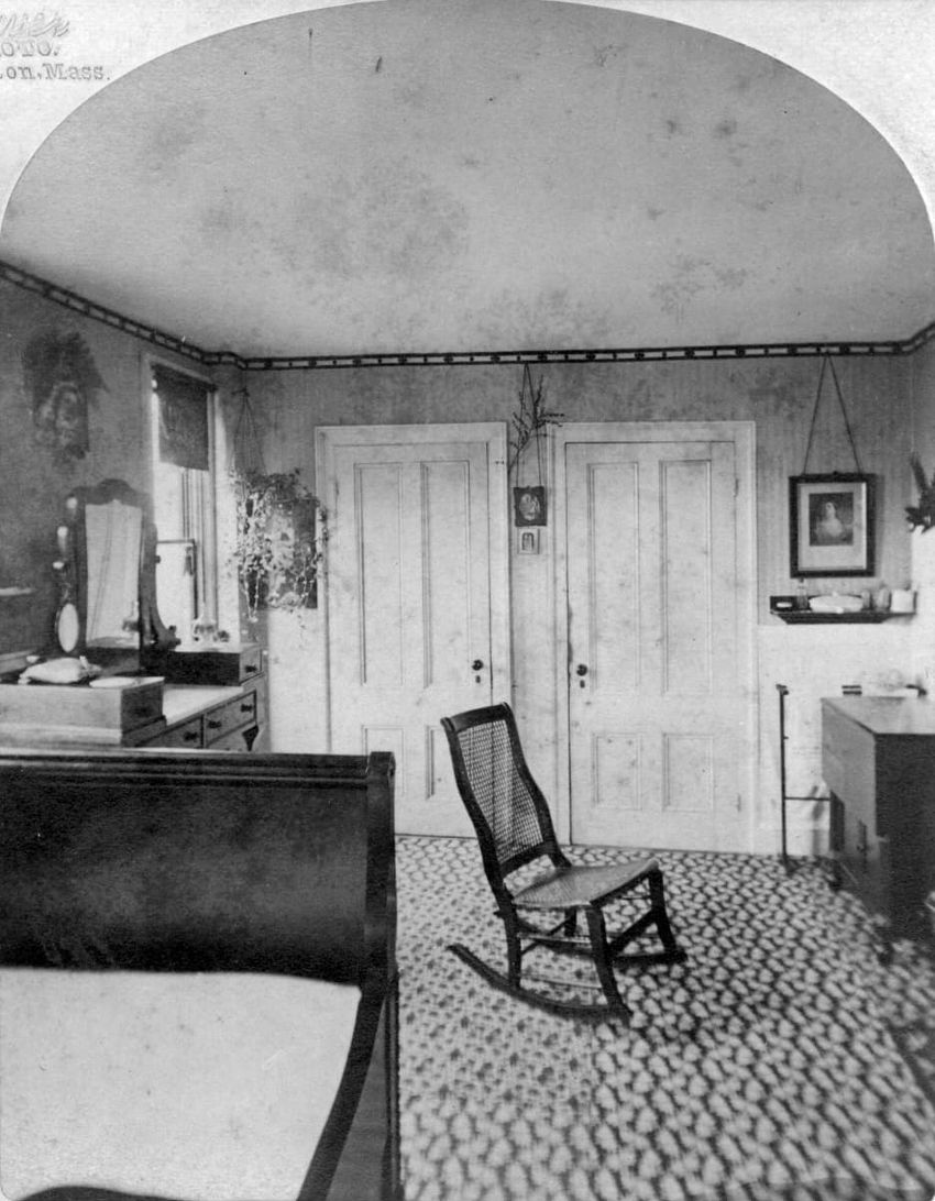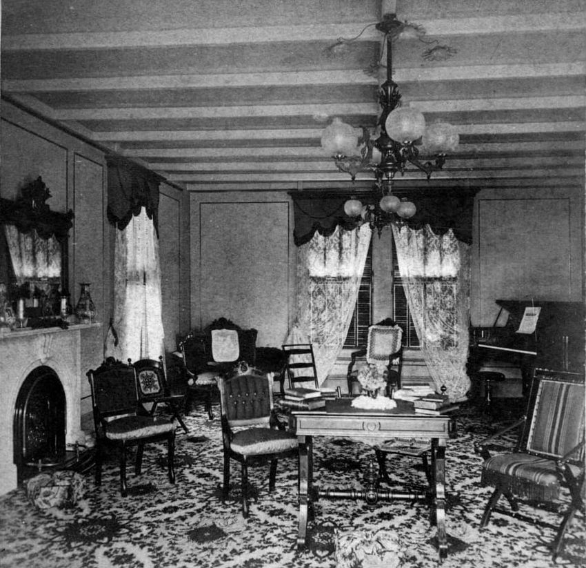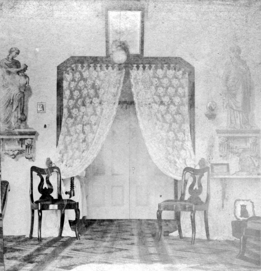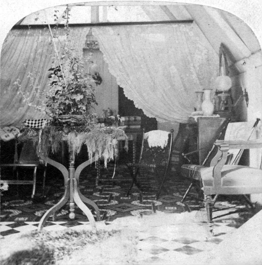 Interior stereo view photograph of Mr. Francis Parker Appleton, Mrs. Alice Appleton Knowles and Mrs. Francis Parker Appleton in the parlor (drawing room) of the Appleton House, Lowell, Mass.