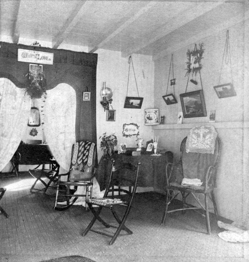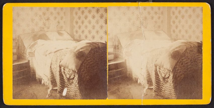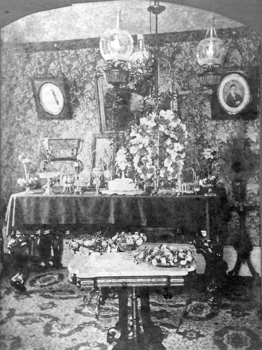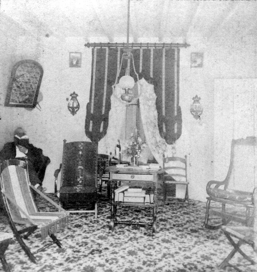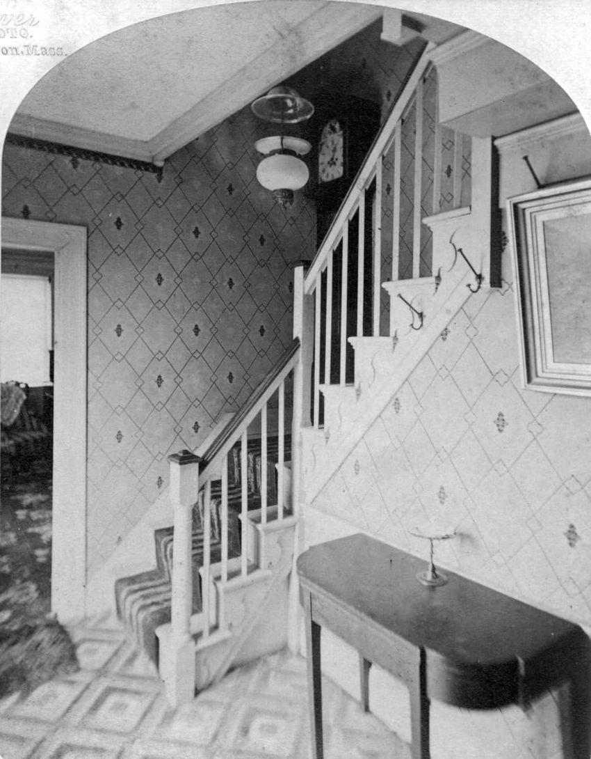 Interior stereo view photograph of Mr. Francis Parker Appleton, Mrs. Alice Appleton Knowles and Mrs. Francis Parker Appleton in the parlor (drawing room) of the Appleton House, Lowell, Mass.