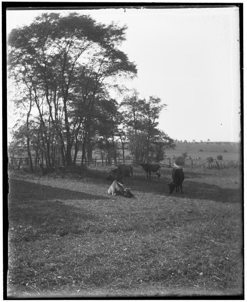 The image shows a rural scene in Milton, Massachusetts, featuring cattle grazing in an open field. In the foreground, there is a stone wall, and a small pond is visible nearby. Trees and a house can be seen in the background, all set against a backdrop of rolling hills.