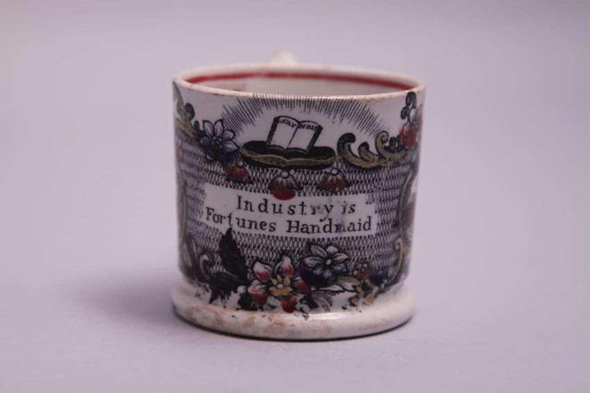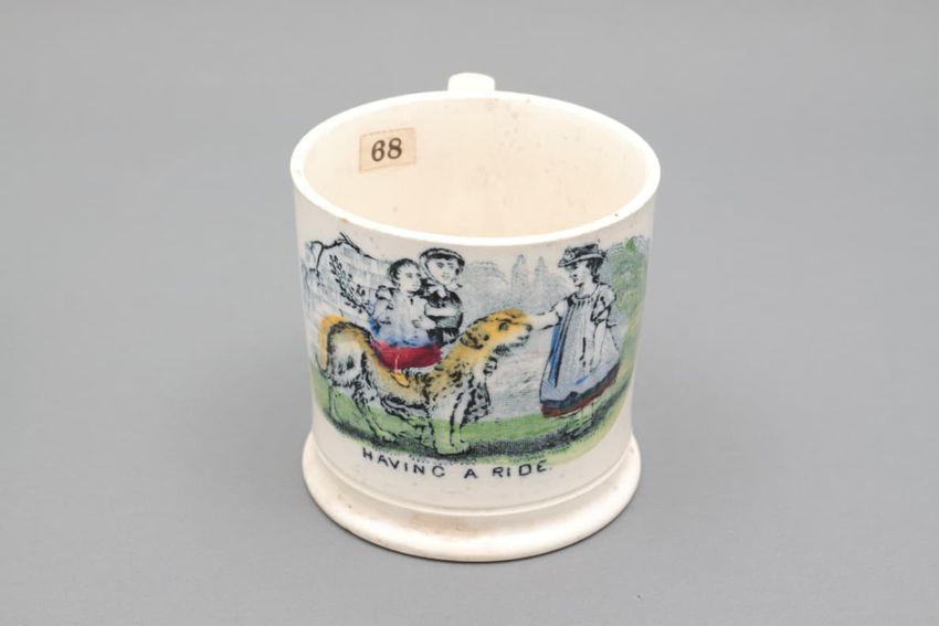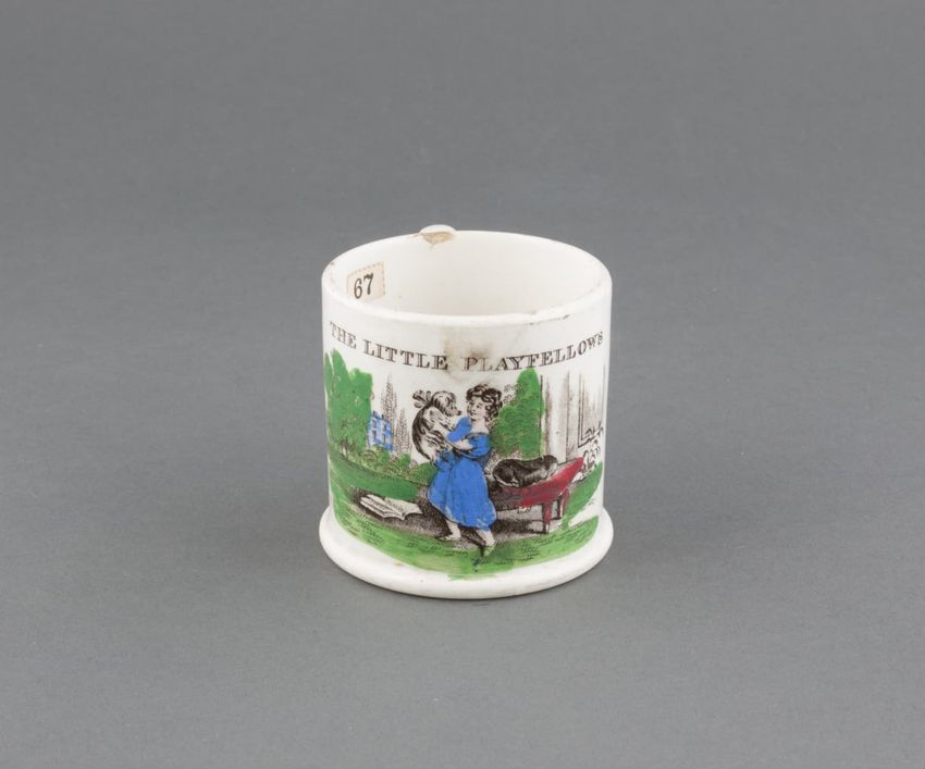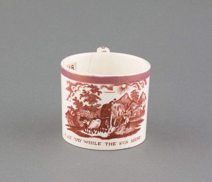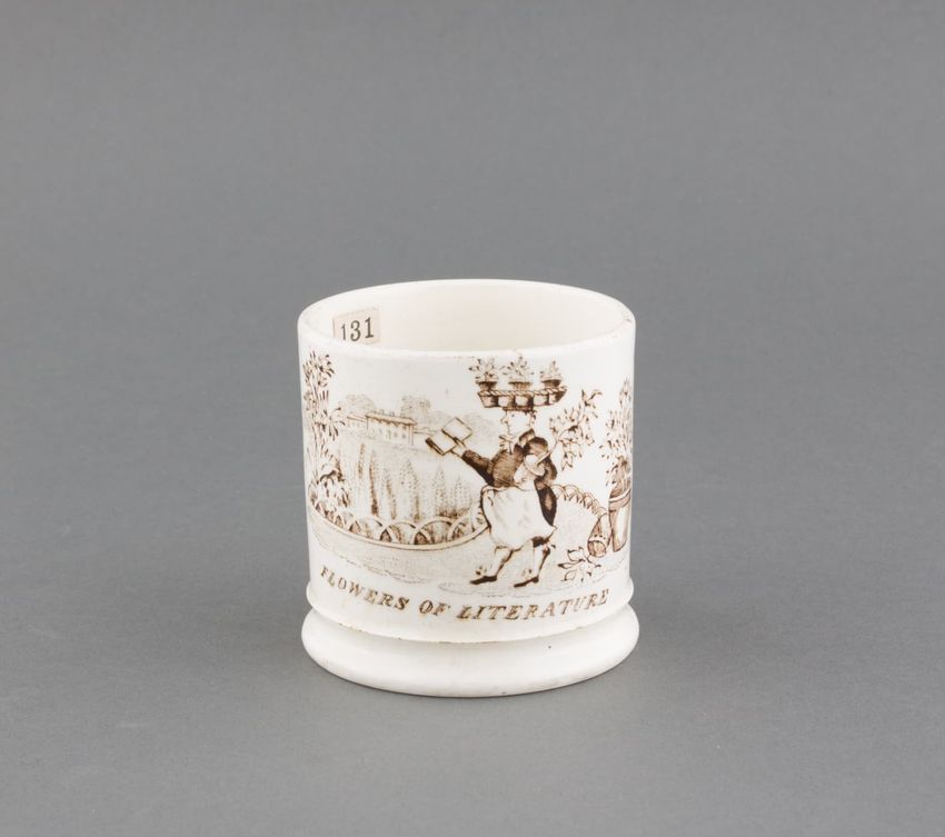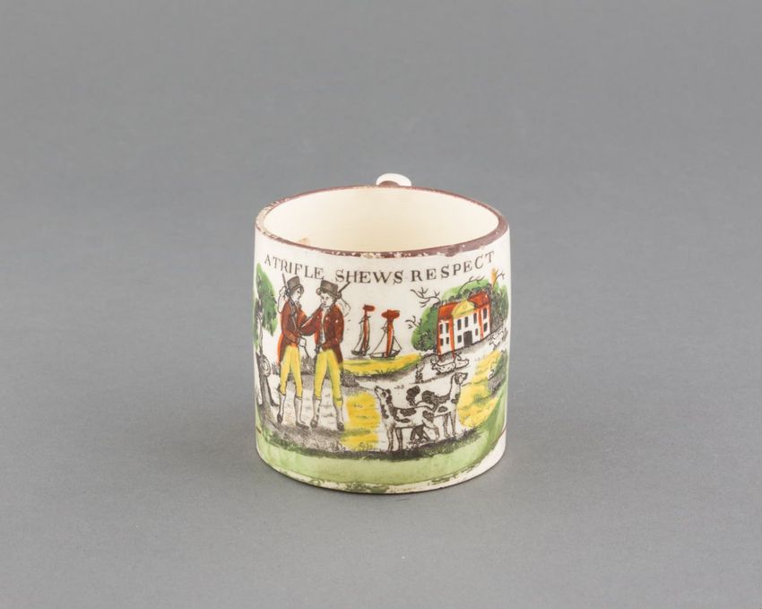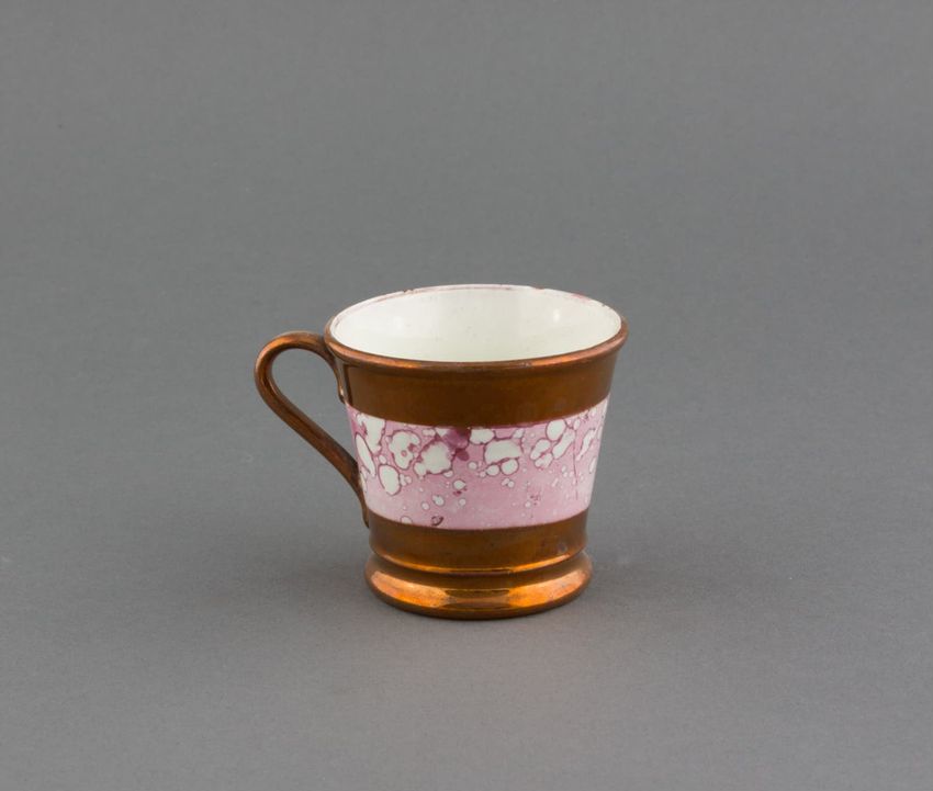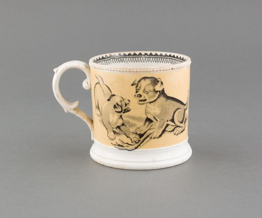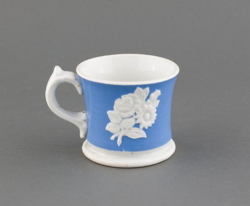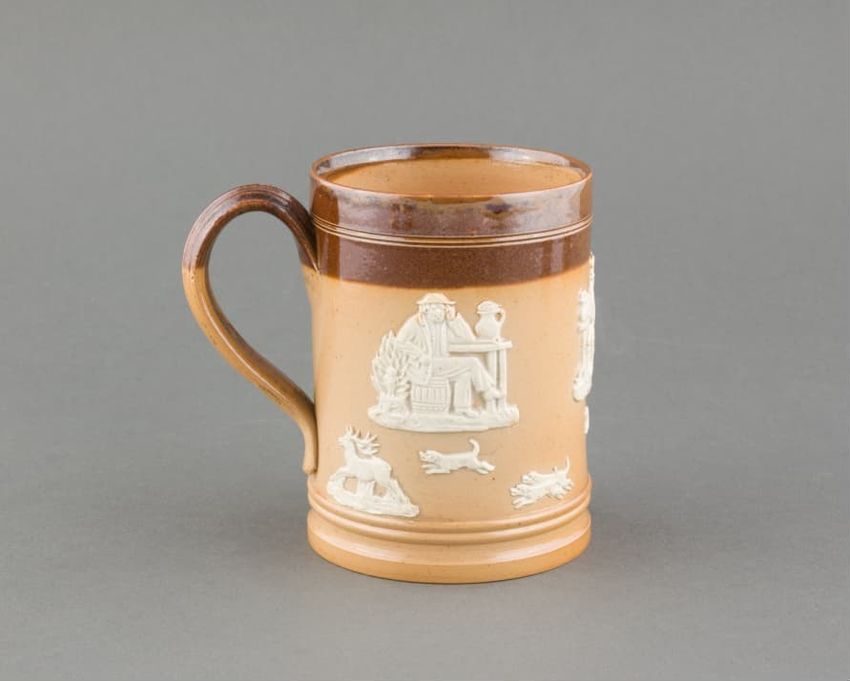 Earthenware mug. Round-rimmed and reeded base, beaded rim, and ear-shaped handle with molded foliate design. Taupe glaze. Applied floral motif (rose) on each side, overpainted with red, yellow, and green.