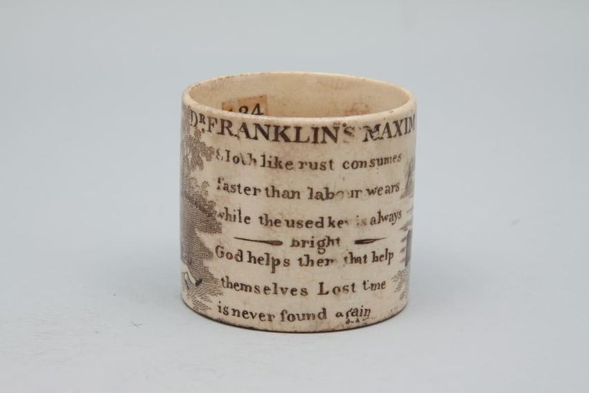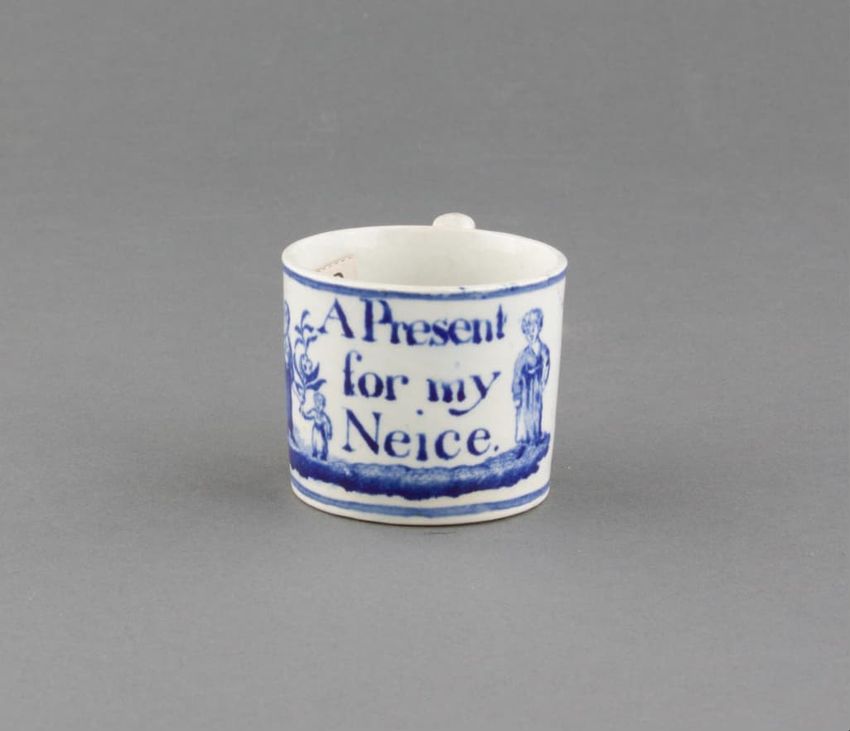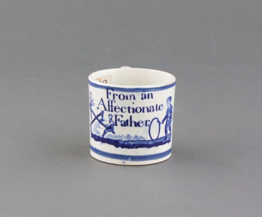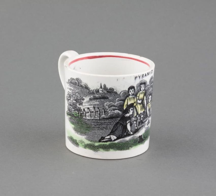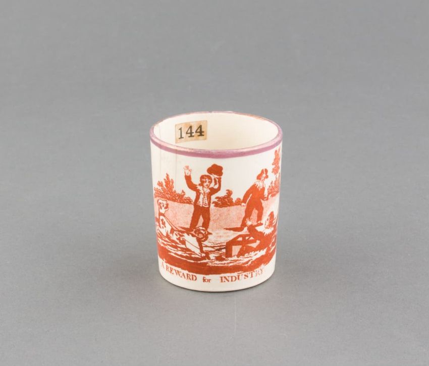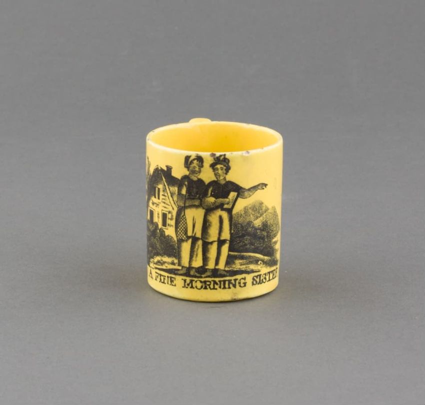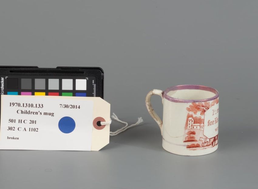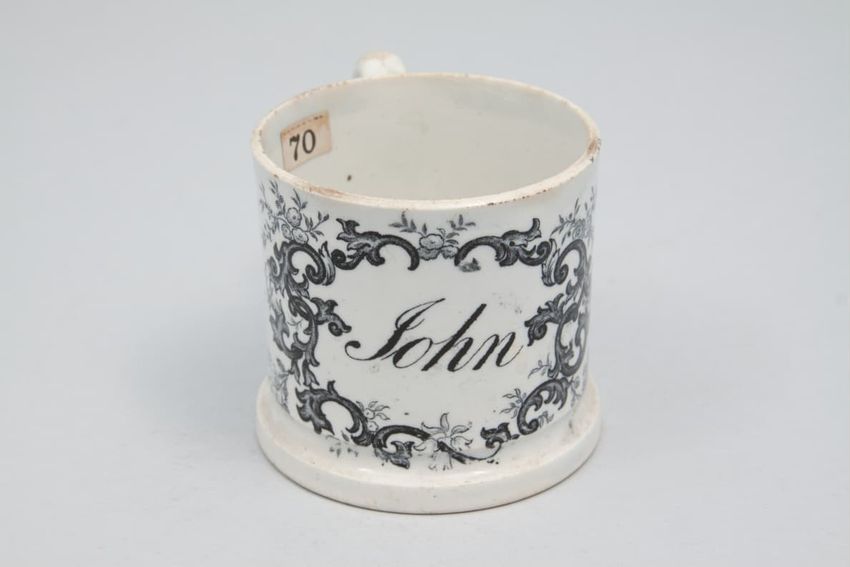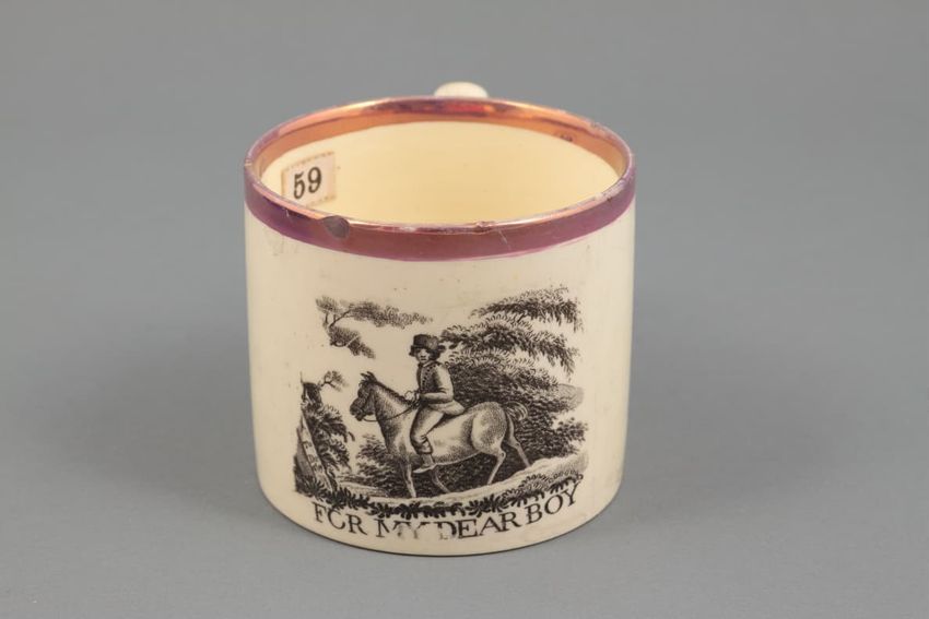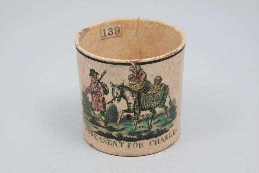 Earthenware mug. Round-rimmed and reeded base, beaded rim, and ear-shaped handle with molded foliate design. Taupe glaze. Applied floral motif (rose) on each side, overpainted with red, yellow, and green.