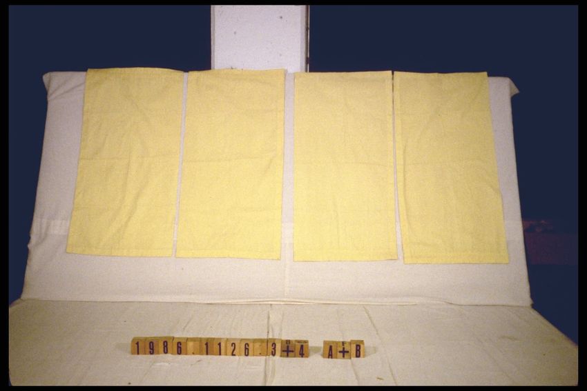 Alphabet Sampler with floral border. Vertical rectangle. Natural linen ground. Silk thread. Alphabets occupy top two-thirds of space. Blue lettering. Flower border, polychromatic. Alphabets: #1 complete, #2 missing "J", #3 missing "J" Numbers: "1-9,0"; cross stitch, satin stitch, French knots.