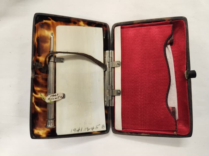 block printing (relief printing process), chintz, cotton (textile), fringe, glazing (coating), stitching, weaving, machine-made, piecing, tabby (textile), alteration (process and technique), tin (metal)