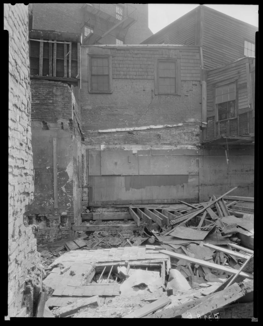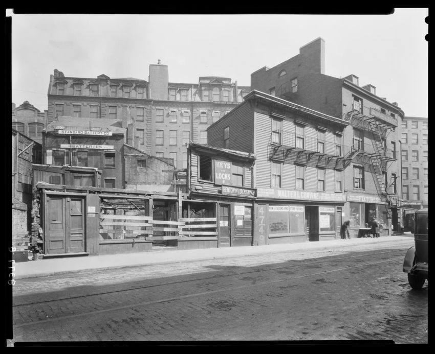 The image depicts Dock Square in Boston, Massachusetts. Visible are multiple buildings with various signs, including "S.J. Sands Plumber and Gas Fitter," "L. Trastram Sheet Metal," "Quick Lunch," and "Tea Coffees." Horse-drawn carriages are visible on the streets and pedestrians are walking on the s...