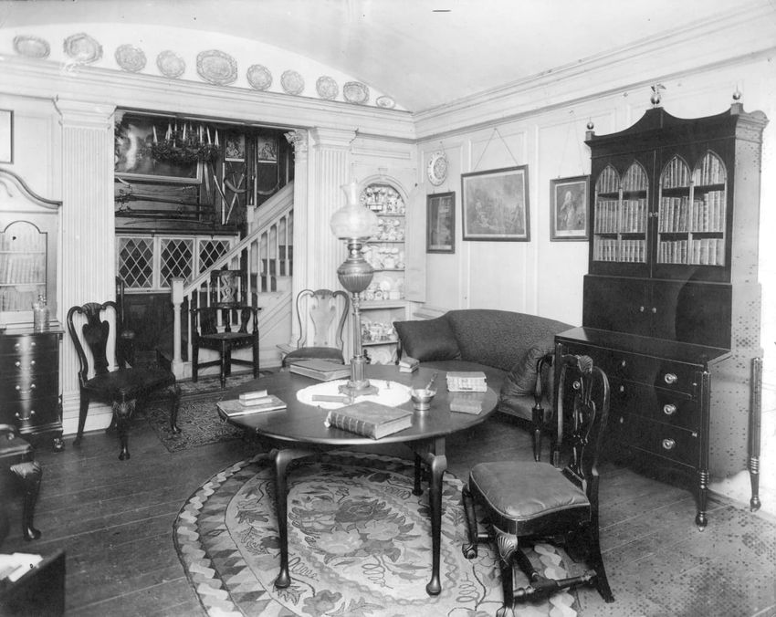 The woodwork taken from the Council Room in Province House can be seen above the mantel. Province House (Boston) was the seat of the royal governors of the Massachusetts Bay Colony.
