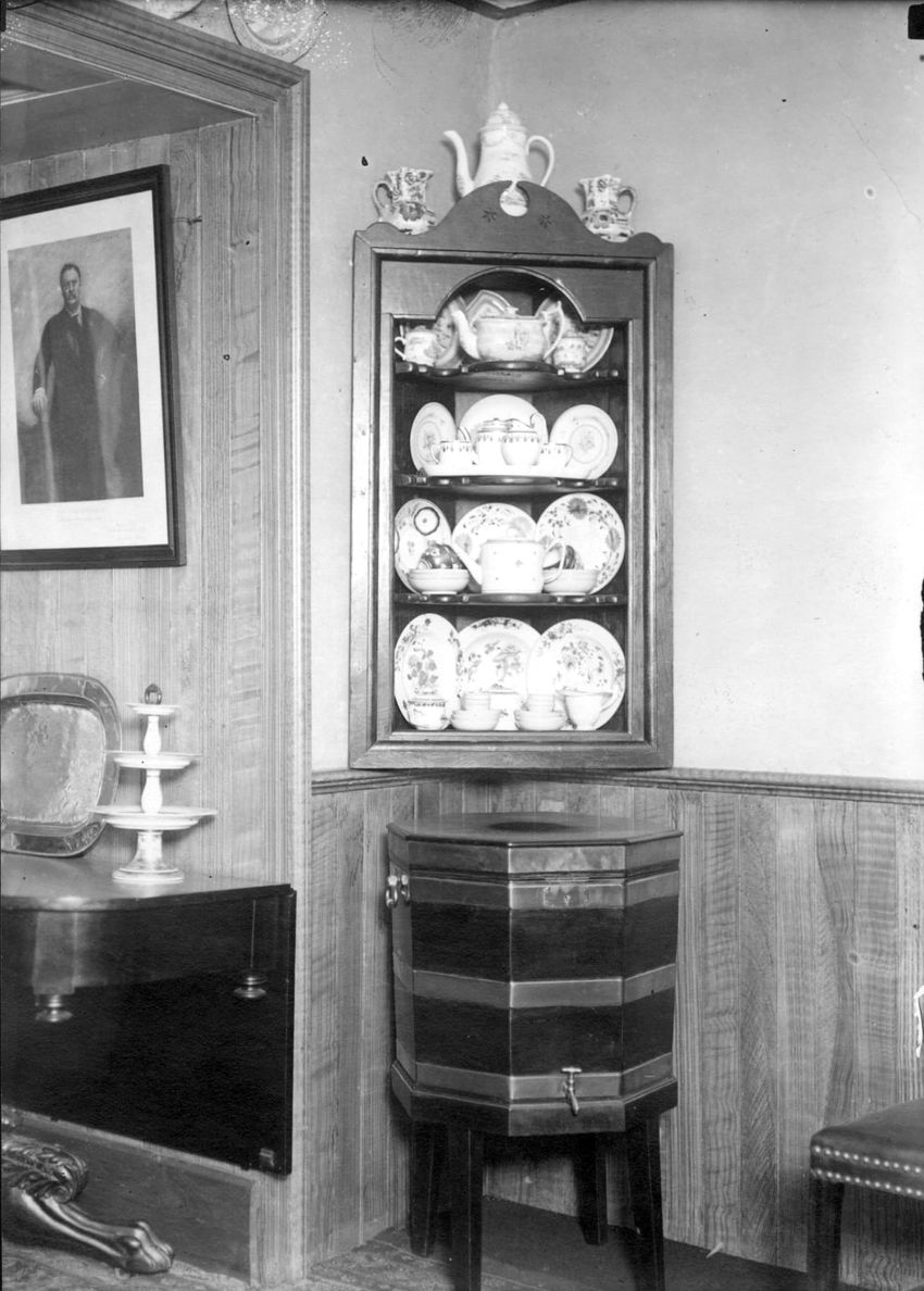A portrait of Theodore Roosevelt can be seen to the left of the china cabinet.