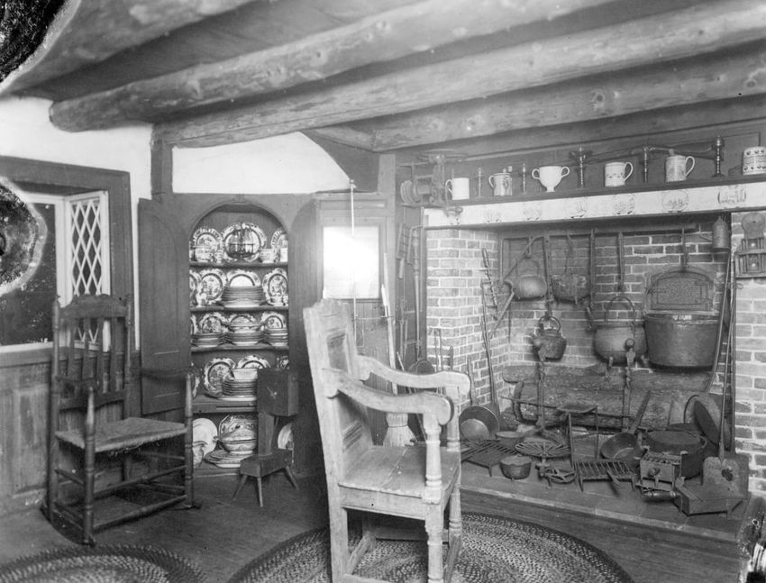 The end of the kitchen with its fireplace full of cooking utensils is seen in this image.