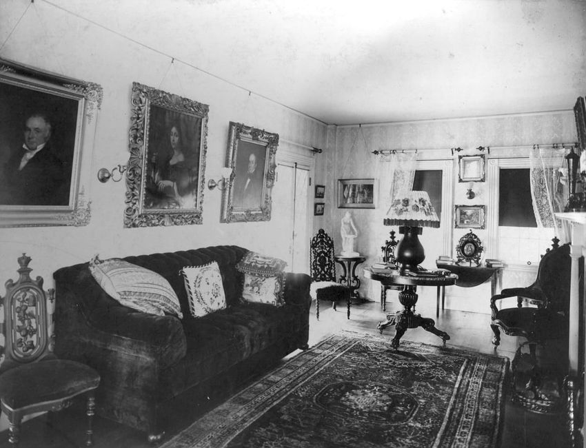 Interior photograph of the parlor (living room) in the William Butler Clark House, Pigeon Hill, Weston, Mass.