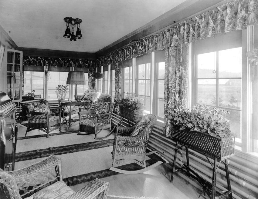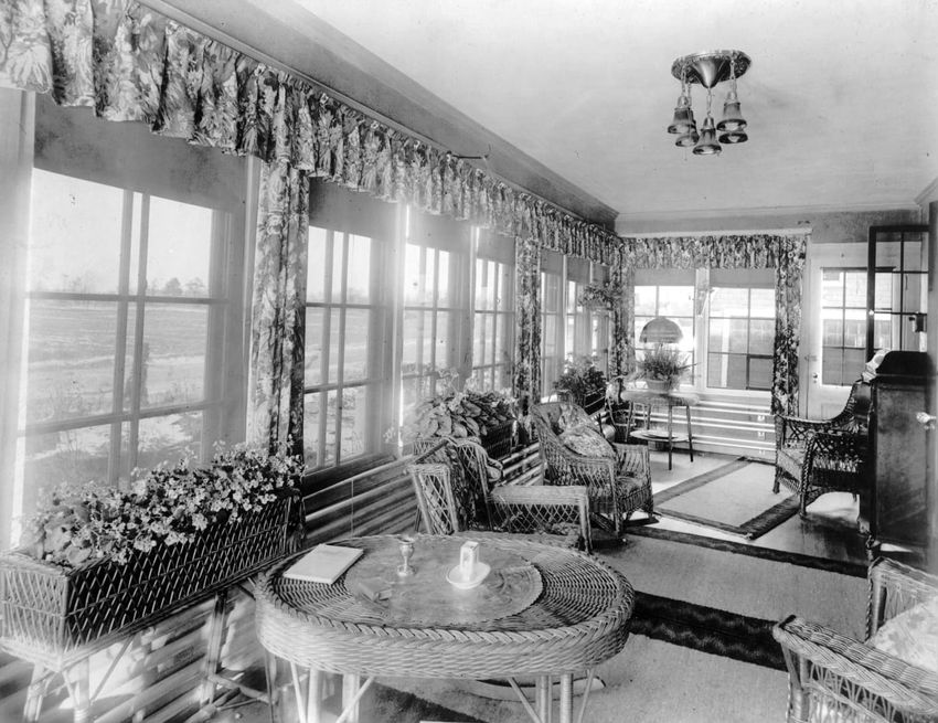Interior photograph of the porch in the Harry A. Cox House, Winchester, Mass.