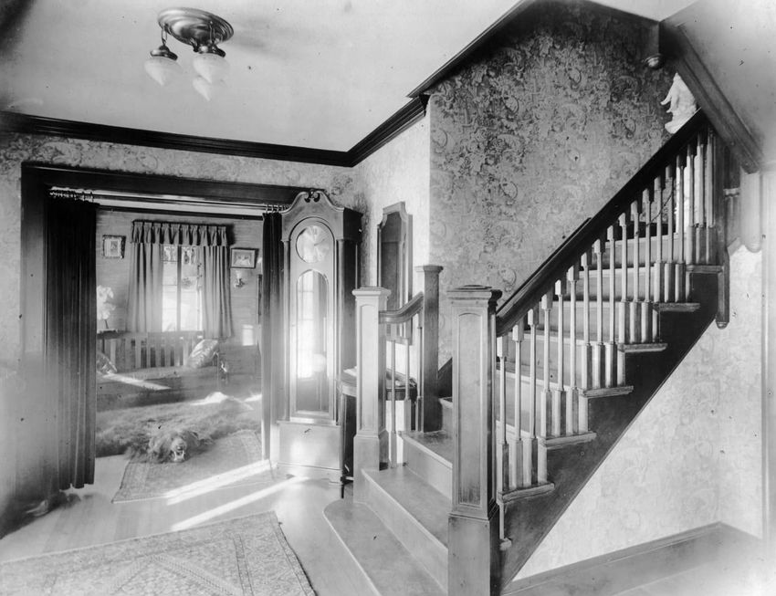 Interior photograph of a stairwell in the Loring House, Loring St., Weston, Mass.