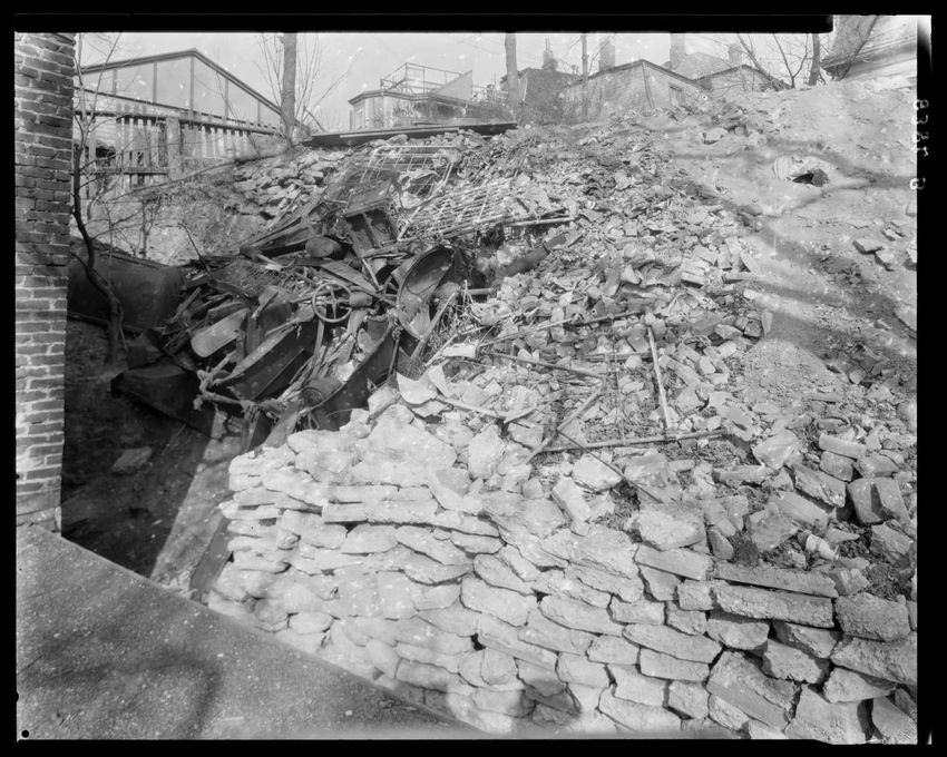 The image depicts the rear exterior of a ruined building located at 124 Marcella Street, Roxbury, Boston, Massachusetts. The scene includes a collapsed structure with debris, bricks, metal parts with a visible steering wheel, and other miscellaneous rubble. A brick wall is partially visible on the l...