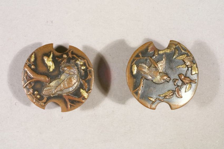 Pair of gold sleeve clips in the form of a buckle with engraved floral design.