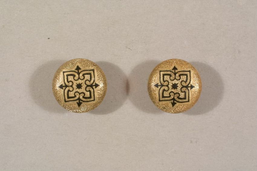 Pair of gold and black enamel cuff buttons. Spade-like decorations.
