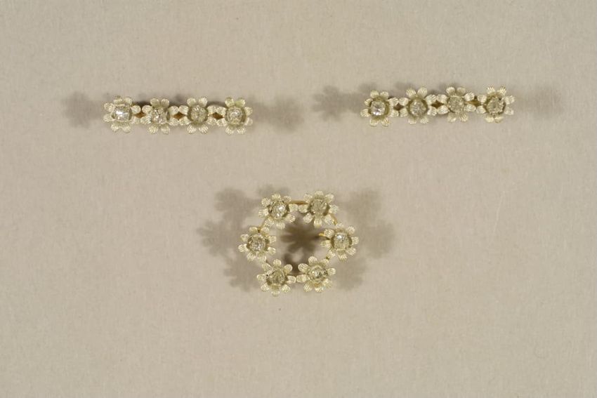 Set of three metal flower brooches. Two thinner elongated (4 flowers each with center stone], one circular brooch (6 flowers with stone in center along circumference.)