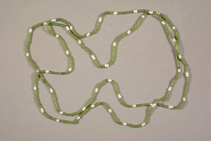 White bead necklace with brown and black bead decorations and carved circular carved jade pendant.