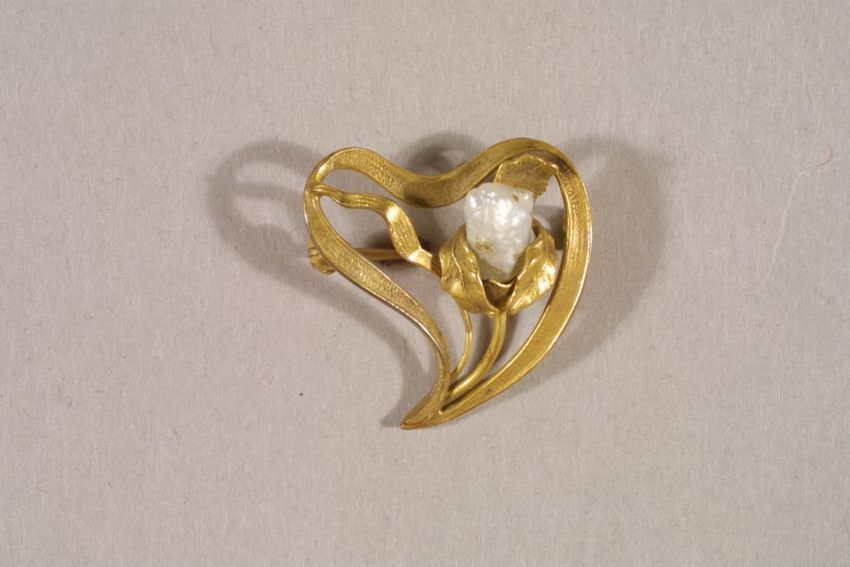 Heart shaped gold brooch set with a pearl. The baroque pearl forms the blossom of a gold-stemmed flower set in a gold ribbon "frame" that forms an asymmetrical heart shape.