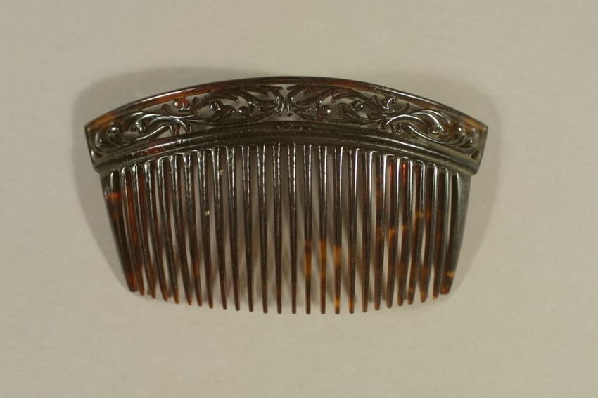 Each of this pair of tortoiseshell bar pins is decorated with gold pique and silver inlay in a pattern of grapeleaves and vines. Each pin closes with a hinged pin and hook on the reverse.
