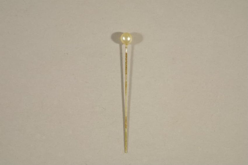 Gold stick hatpin with amethyst head and pearls around its circumference.