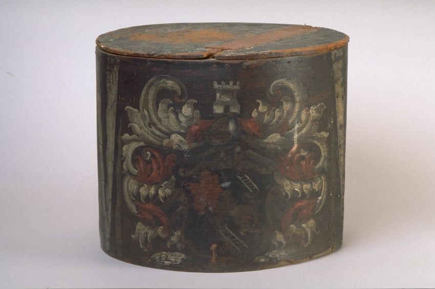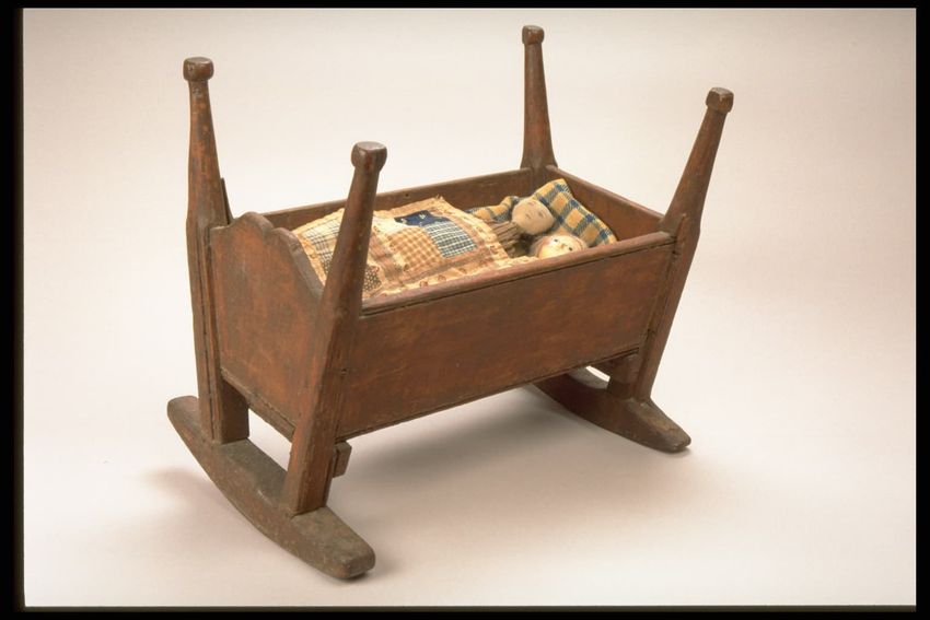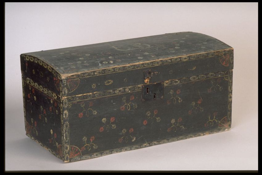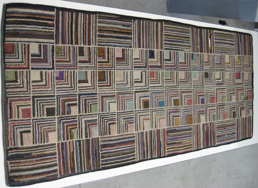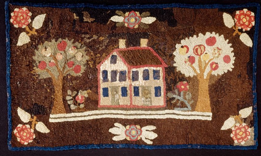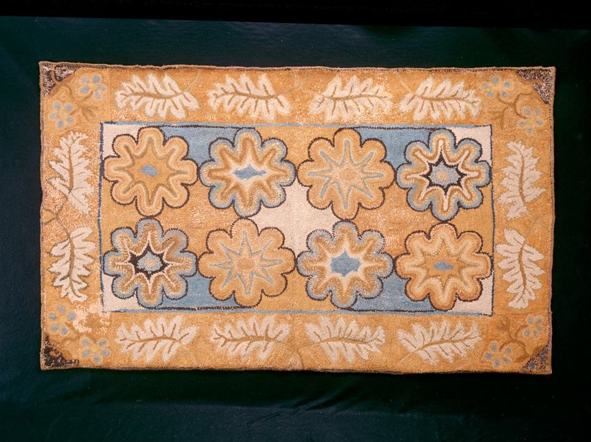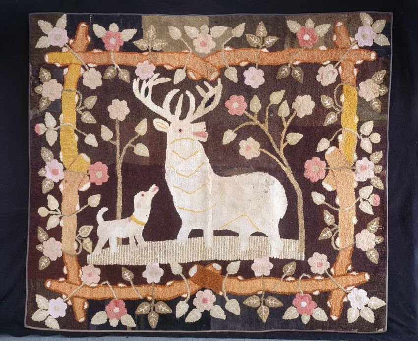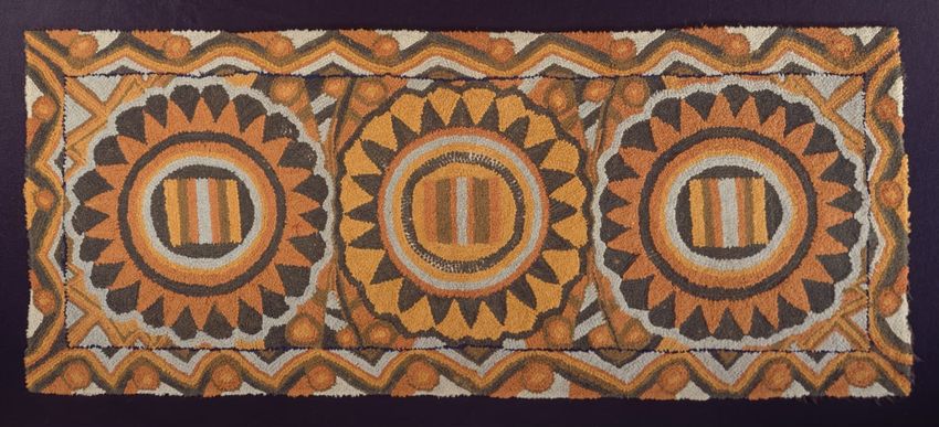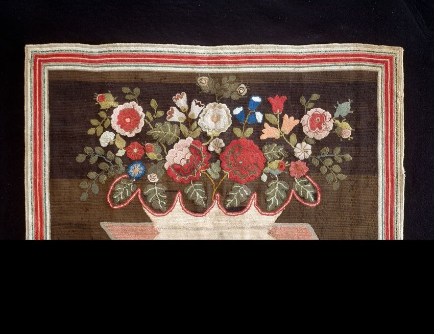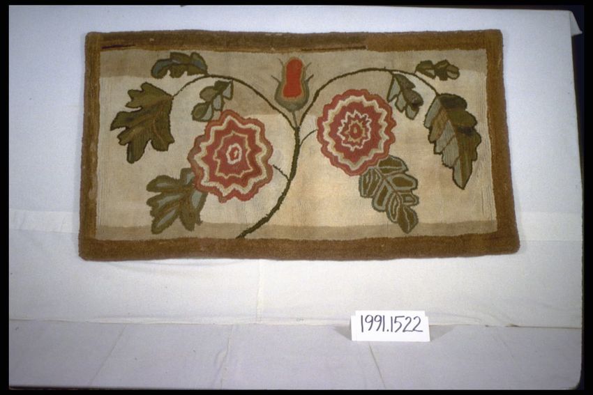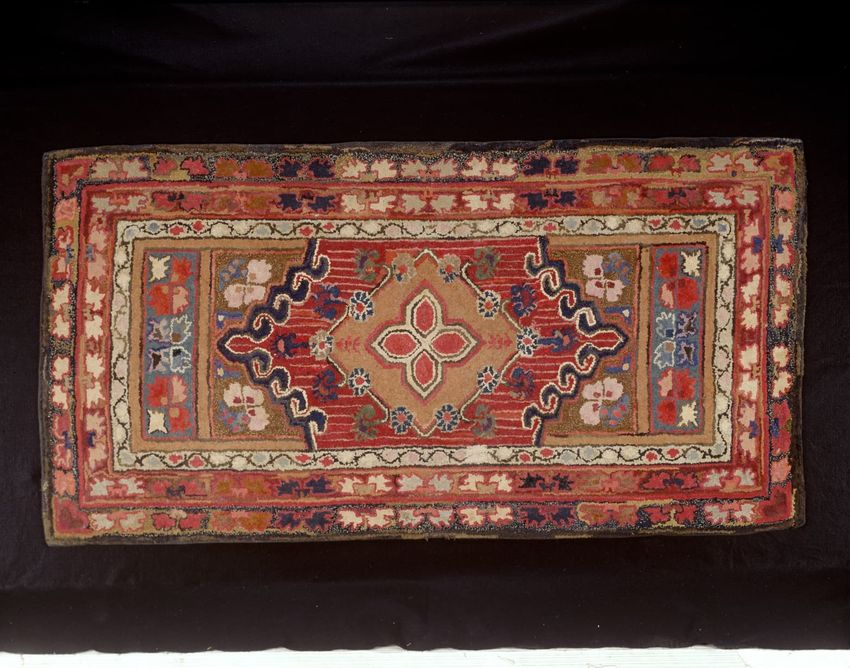 Of rectangular form, man oriental design with central medallion flanked by end panels enclosed by three patterned borders worked in wool in shades of: red, blue, buff, green, gray, pink and white on a burlap foundation and a black cotton tape binding. After pattern no.108 by E.S. Frost, a copy of a ...