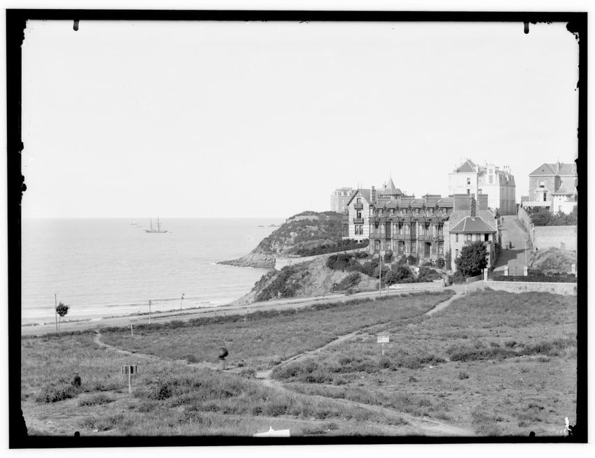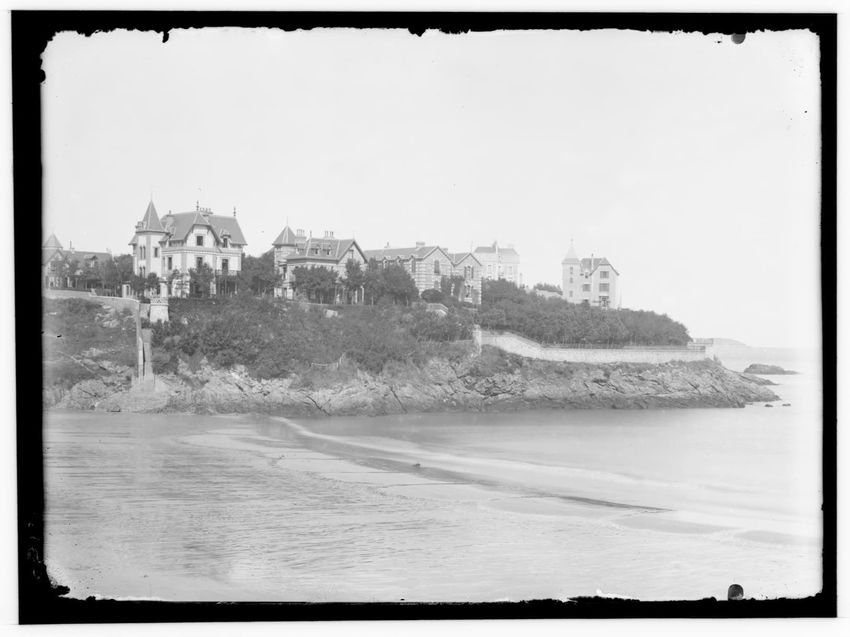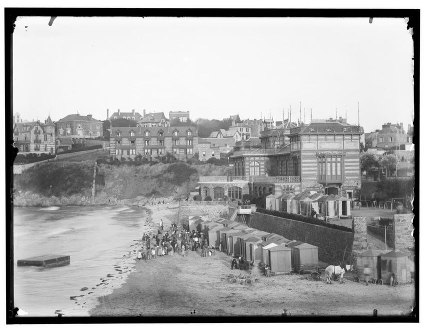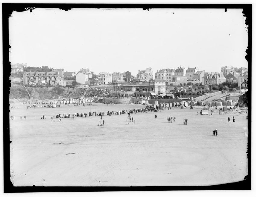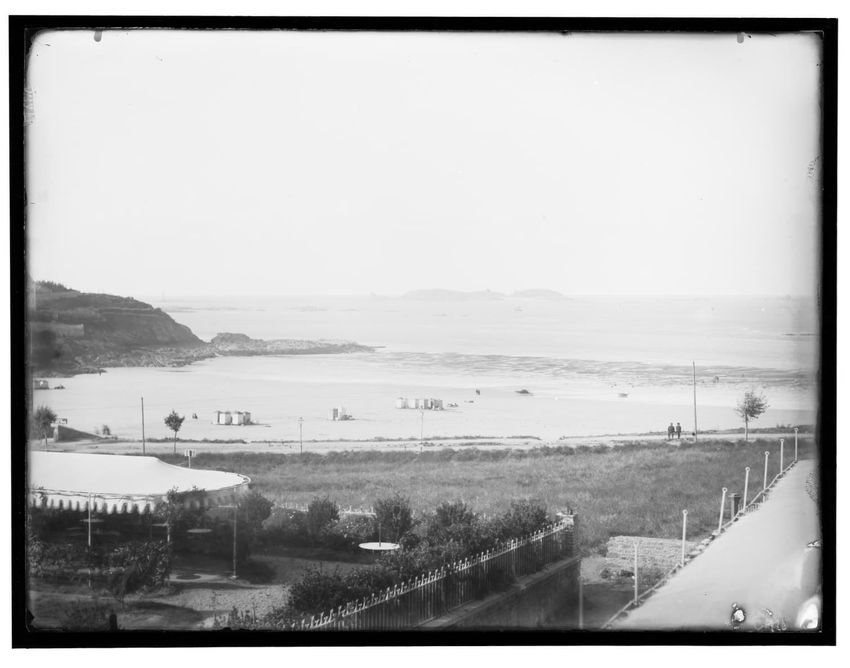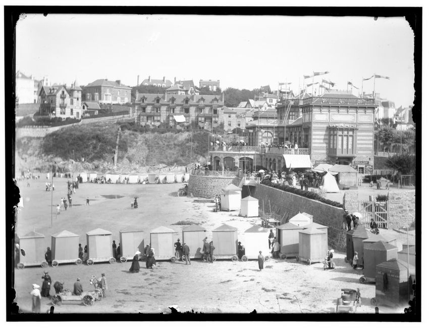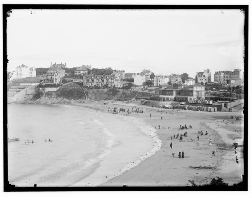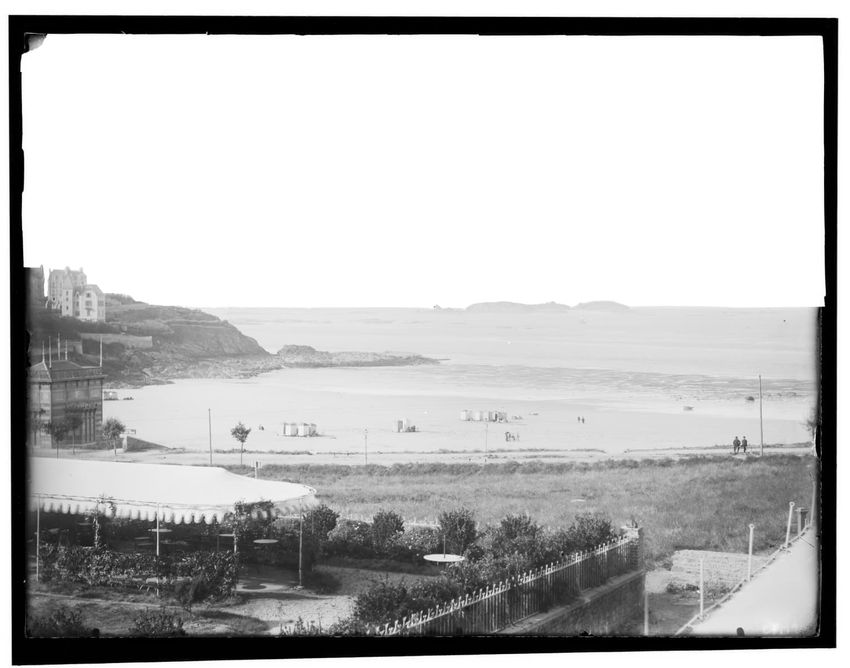 The image depicts a beach in Dinard, France. In the foreground, there is a garden with pathways, a covered area, and decorative plants. Behind the garden, there are buildings along the coastline overlooking the beach and the sea. Several houses and larger structures are visible on the distant hills....