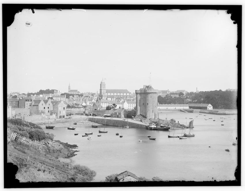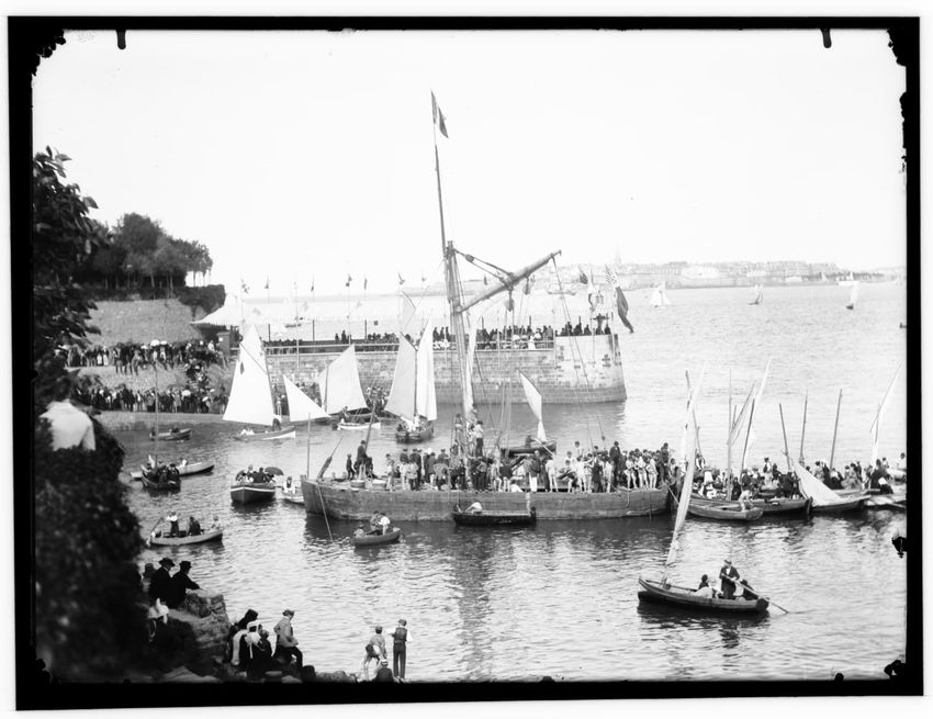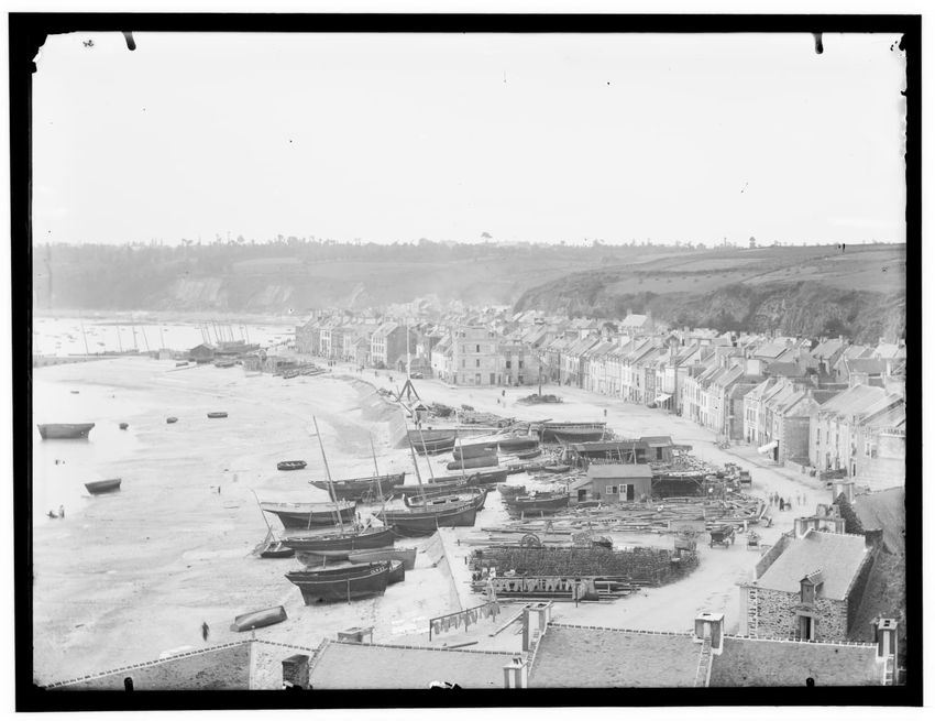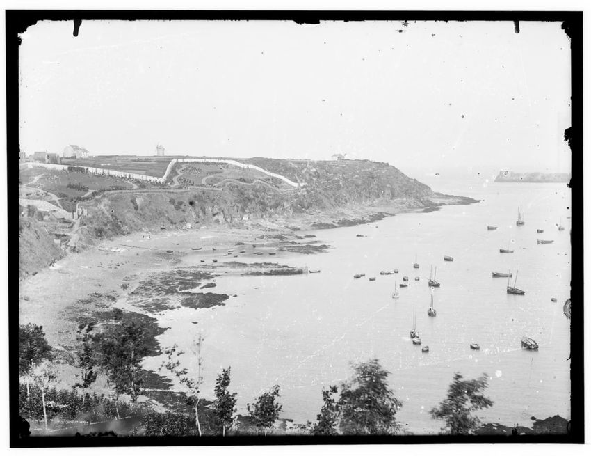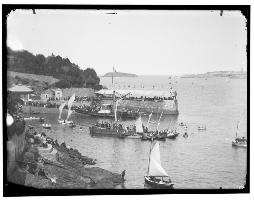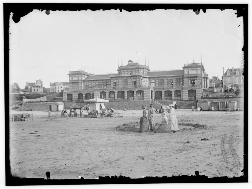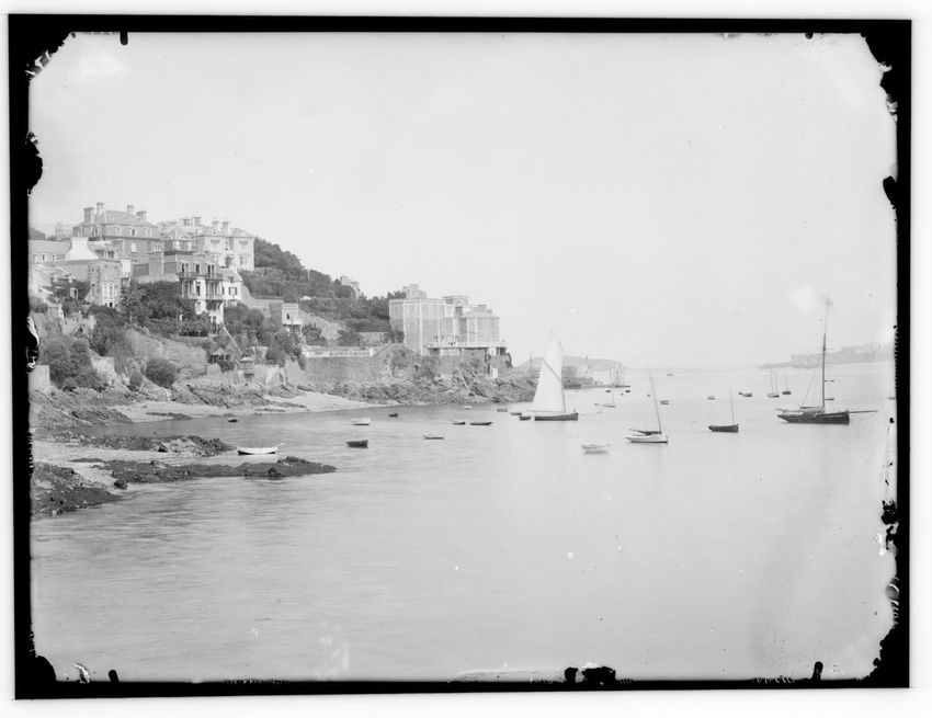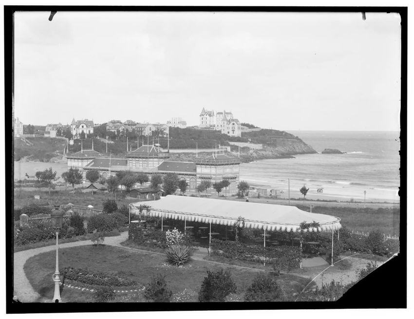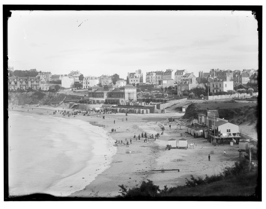 The image depicts a beach in Dinard, France. In the foreground, there is a garden with pathways, a covered area, and decorative plants. Behind the garden, there are buildings along the coastline overlooking the beach and the sea. Several houses and larger structures are visible on the distant hills....