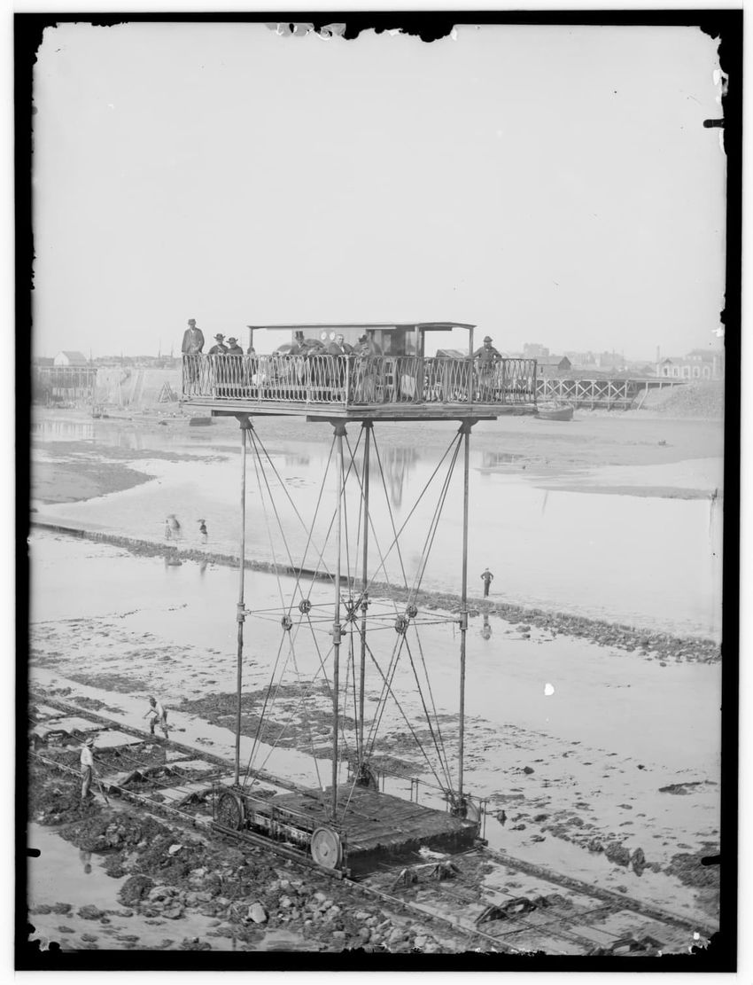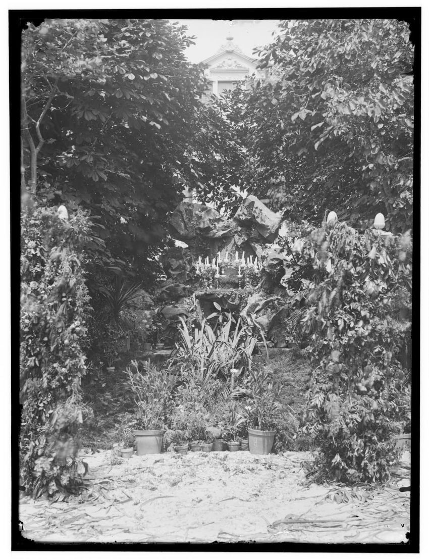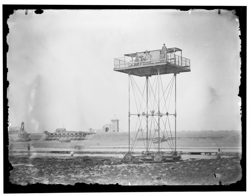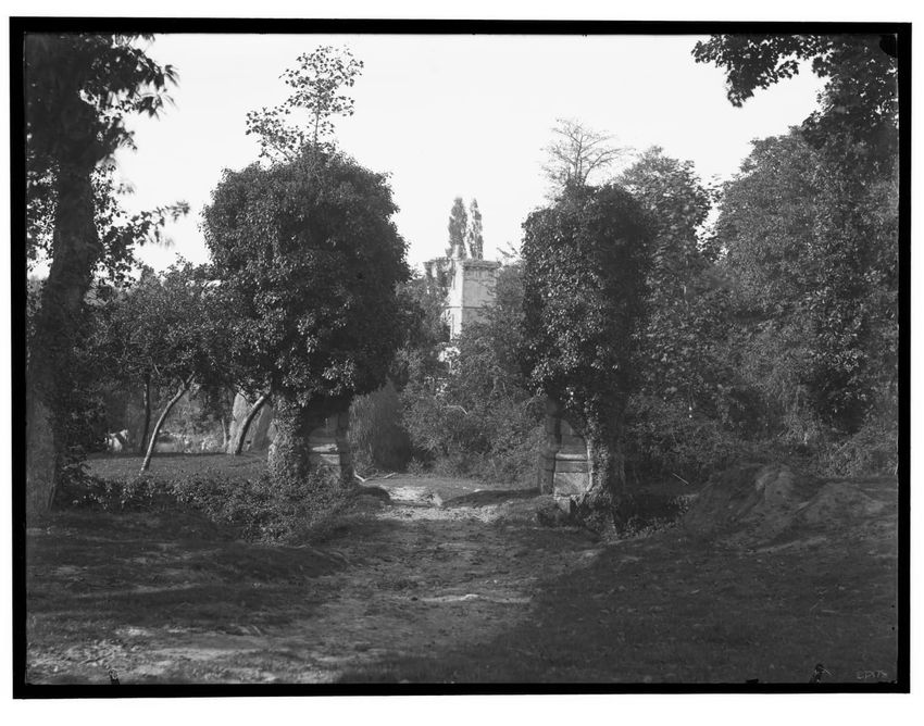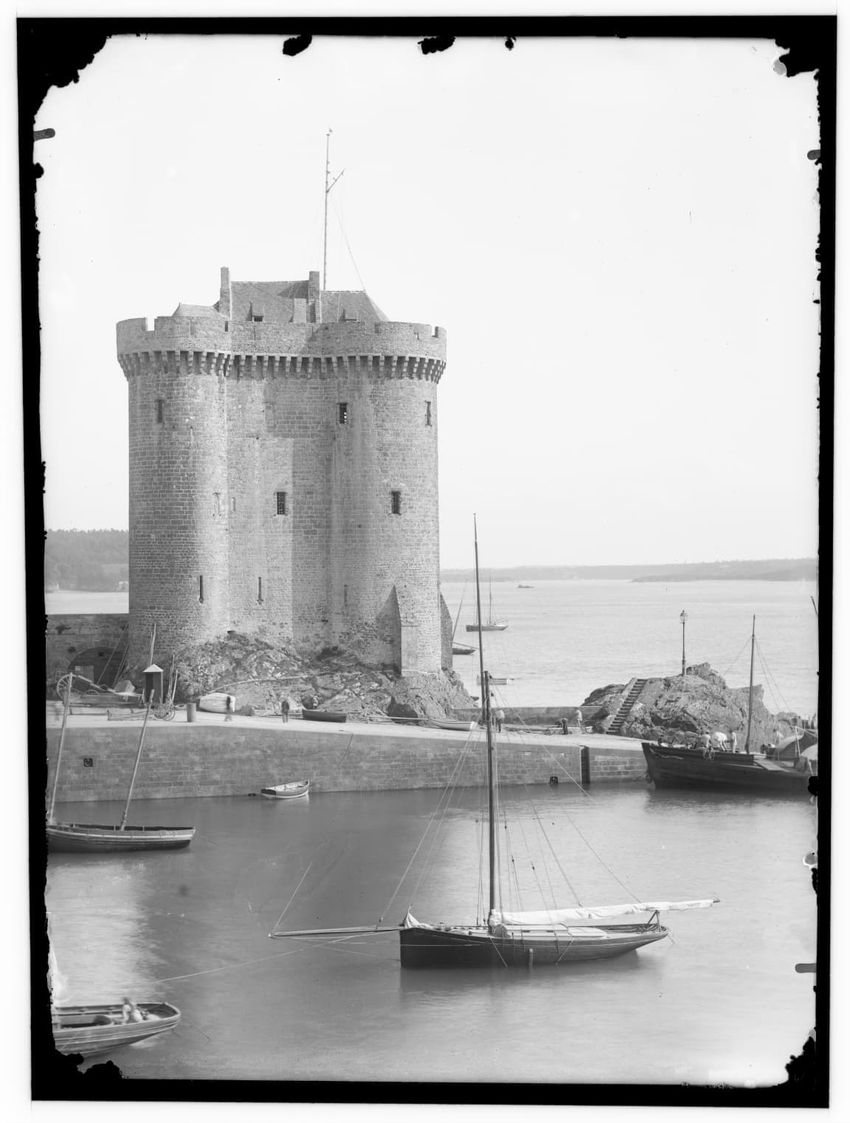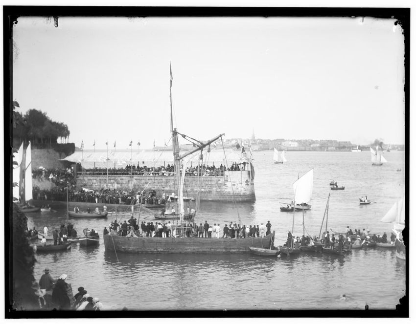 The image depicts a beach in Dinard, France. In the foreground, there is a garden with pathways, a covered area, and decorative plants. Behind the garden, there are buildings along the coastline overlooking the beach and the sea. Several houses and larger structures are visible on the distant hills....